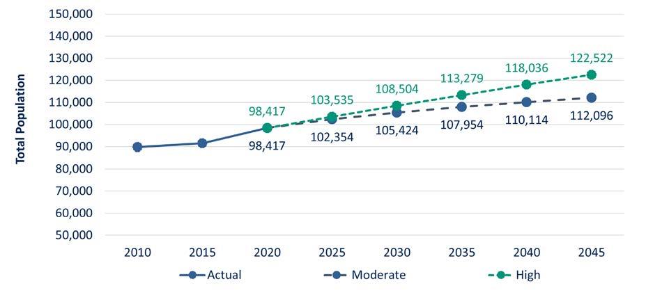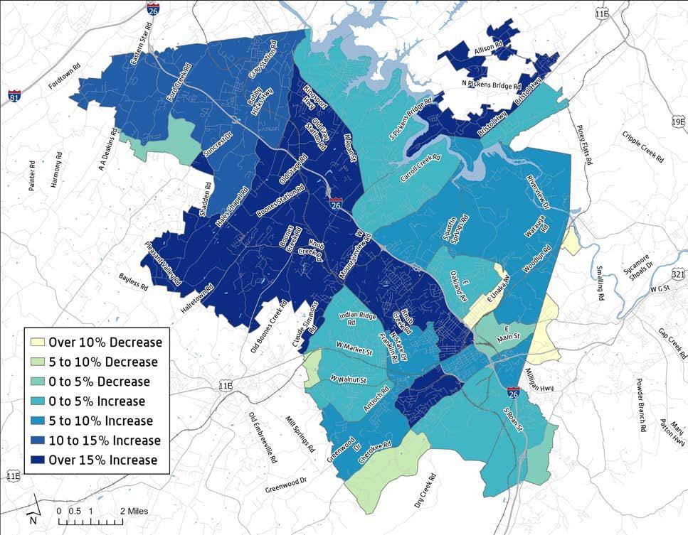 Johnson City is one of the fastest growing municipalities in the region. The Study Area accounts for more than 48% of the population in the MSA and over 74% of the population in Washington County. Over the next 20 years, the Study Area is moderately projected to add roughly 13,600 residents. In the higher growth projection, over 24,100 new residents are estimated.