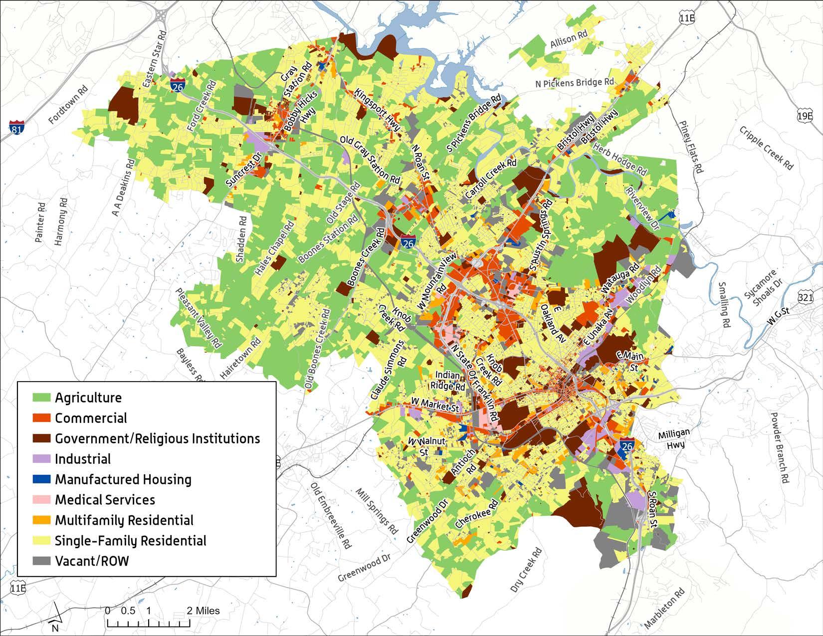 The Existing Land Use Map on the facing page shows land use in Johnson City today based on the categories below. These use categories are based on surveys conducted for property valuation.