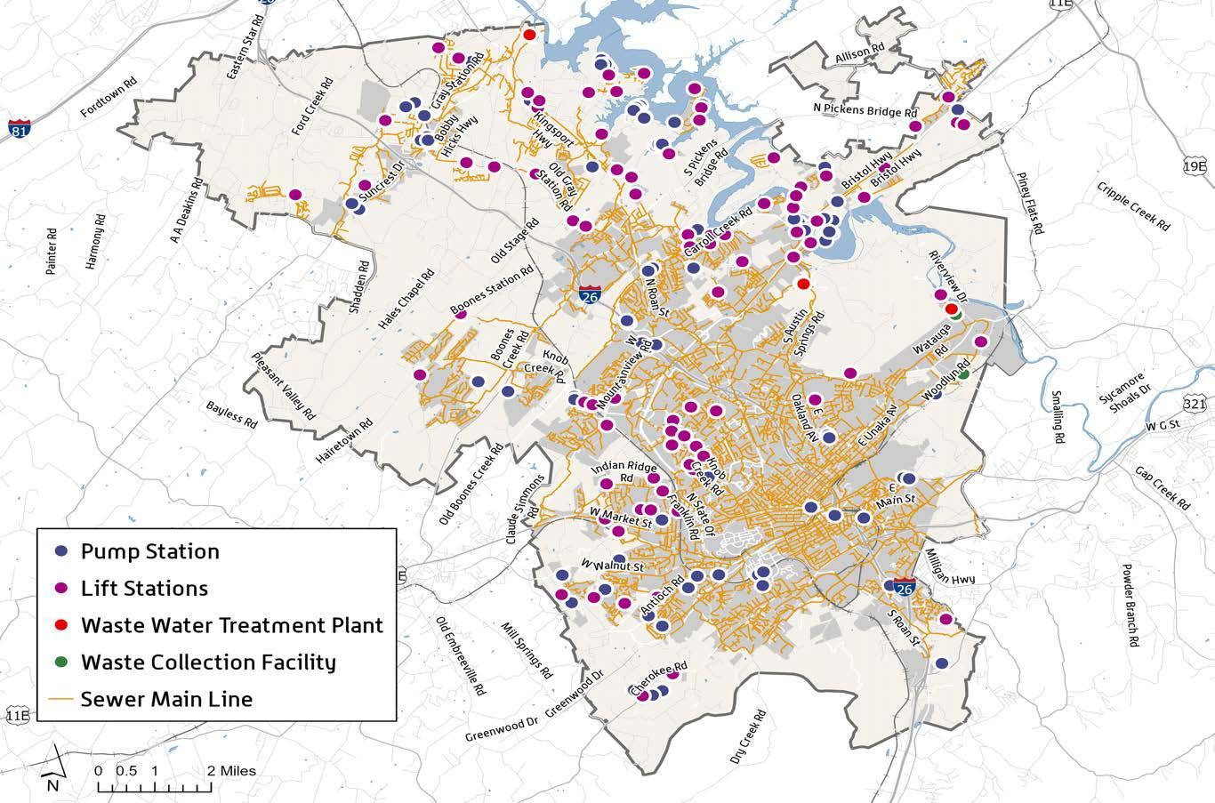 Like the water system, the Water and Sewer Department manages the city’s sewer system, which includes sewer lines, mains, and pump stations. The sewer system serves areas within the Johnson City limits and various unincorporated areas within Washington, Carter, Sullivan, and Unicoi Counties. The total system includes three wastewater treatments plants and roughly 762 miles of sewer line. The majority of the lines within the system are gravity lines, meaning they rely on gravity to move sewage through the system and to pump stations and, ultimately, treatments plants.