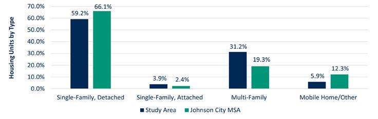 The number of housing units in the Study Area has increased at a faster rate (8.8%) when compared to Johnson City or the larger MSA.