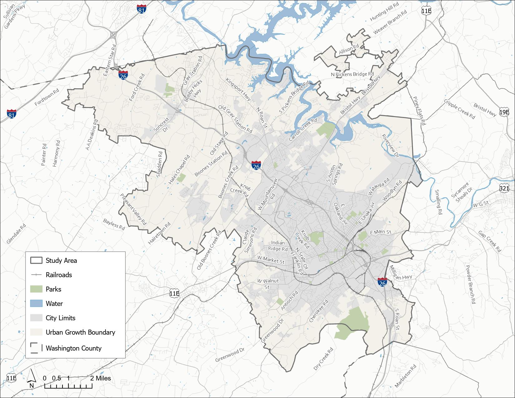 Horizon 2045 focuses not just within the City limits, but extends beyond to incorporate an area called the Urban Growth Boundary. Urban growth boundaries were introduced in the state to help manage city growth. Using the Urban Growth Boundary as our Study Area allows the planning process to incorporate City services that extend beyond City limits, such as water and sewer and solid waste removal. It gives a more comprehensive picture of the areas that influence—and are influenced by—Johnson City.