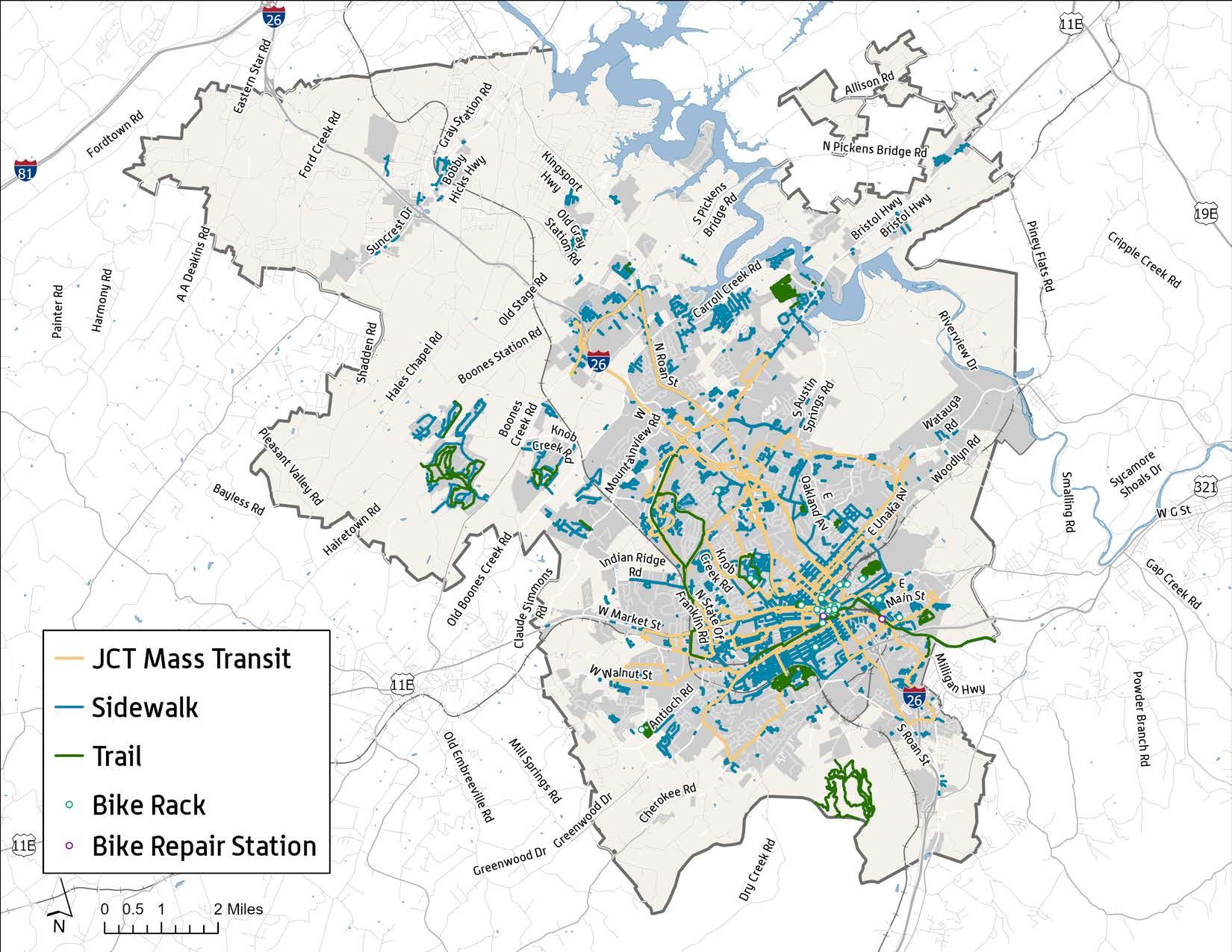 Truly comprehensive transportation networks are multimodal in design, supporting active modes, such as walking and biking, and complimented by a public transportation, or transit, system. The map below shows the existing and planned active transportation and transit facilitates in the area. Having a connective active transportation system that is supported by nearby transit routes and stops encourages additional access to jobs, schools, healthcare, and places of recreation for Johnson City residents and visitors. Horizon 2045 will ensure the alignment of both the physical infrastructure and strategic policy that’s needed to support a multimodal network that’s safe and accessible for all users in the City.