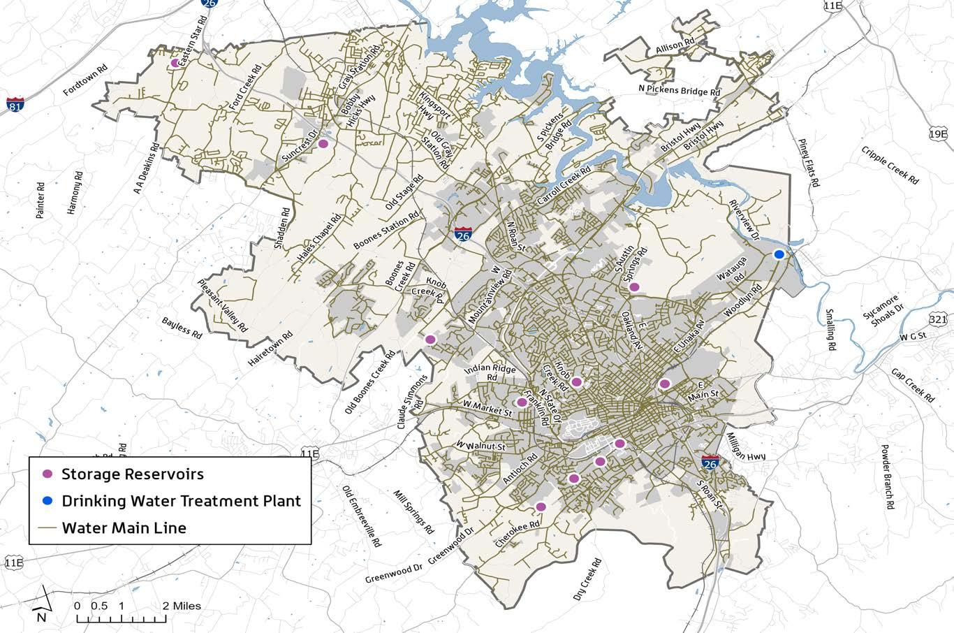 The Johnson City Water and Sewer Department provides water service to residential and nonresidential uses. The system includes two water treatment plants and 951 miles of waterlines. The Department receives water from two sources—Unicoi Springs and the Watauga River, and serves the area within the Johnson City limits and various unincorporated areas within Washington, Carter, Sullivan, and Unicoi Counties.