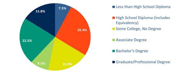 Nearly half (46.8%) of the Study Area population has an Associate Degree or higher. A variety of job types in Johnson City are needed to support the range of education levels and skill sets held by the location population.