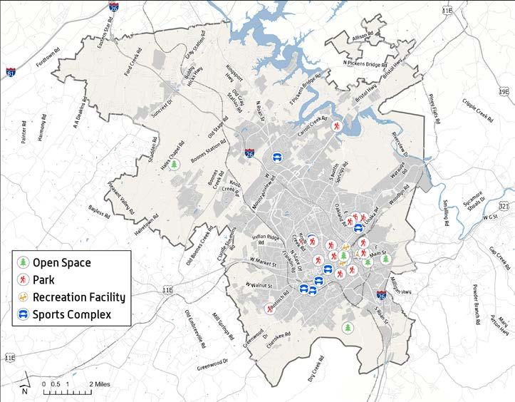 The Study Area includes over 20 parks and open spaces in addition to 5 recreational facilities and 4 sports complexes. Most recreational spaces and parks are located in the heart of Johnson City. These spaces contribute to the city’s quality of life, providing residents and visitors with opportunties for activities and socialization.