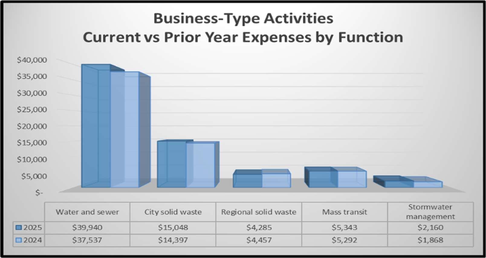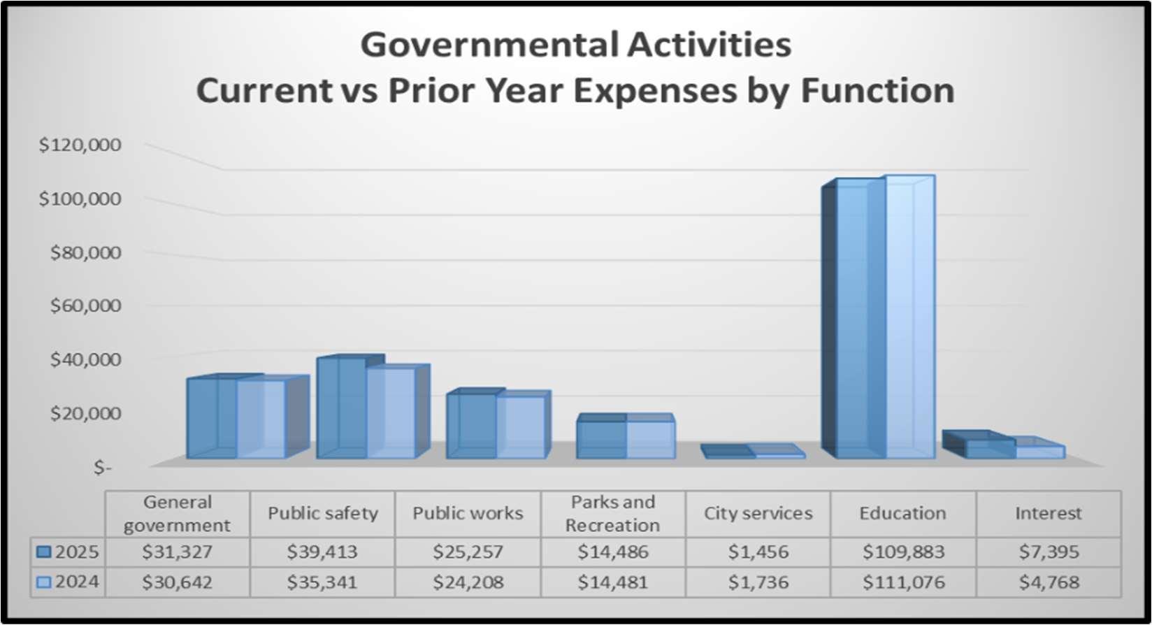 Expenses. Governmental activities expenses saw an increase in fiscal year 2025 due to the payment of a legal settlement in the amount of $27,000. This expense is reflected as an extraordinary item on the financial statements. All other areas remained stable with the exception of Public Safety which saw an increase of 11.5%primarily due to small equipment and professional services expenses.