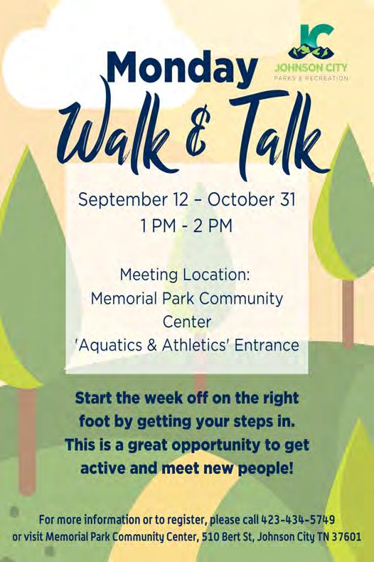 October 2022 Page 19Senior Lifestyles Country HoedownCountry Hoedown Memorial Park Community Center Tuesday October 11th 5:00pm-7:30pm Ages 50+ $3 per person ( Free for Silver and Fit Renew active and Silver Sneakers ) Register by Friday October 7 at Memorial Park Community Center This is a Hoedown Dance with music by Buffalo Mountain Rounders and caller Tyler Hughes. We will serve BBQ and sides . Rec Programs Crochet: Seasonal Garland (Ages 18+) Instructor: Maria Skinner Cost: Free Mondays Now – December 19th 4:00-5:00pm Join Maria in making seasonal garlands. Bring your own crochet hooks and yarns. Skills: Level 2, Easy. Minimum of five people must register. Please register by the Friday prior to the class each week. Monday Walk & Talk (All Ages) Instructor: Roy Oakley Cost: Free Mondays, Now – October 31 1:00 – 2:00pm Start the week off on the right foot by taking an easy stroll to the Tweetsie Trail. We will meet at Memorial Park Community Center by the Aquatics and Athletics entrance and take a nice walk into the Tweetsie Trail. This is a great opportunity to get active and meet new peopl WhereHealingBegins IN-PERSON GRIEF SUPPORT If you or someone you know needs grief support, please attend one of our support groups. (423) 282-1521 • MorrisBaker.com Chelsa Ervin, LCSW In Partnership with:Sponsored by: 1st and 3rd Tuesday of each month 6:30 pm Everlan Johnson City 2623 Peoples Street Johnson City, TN