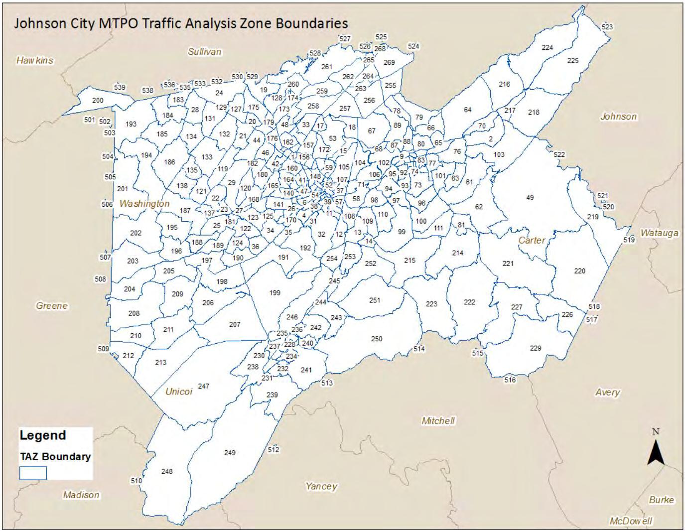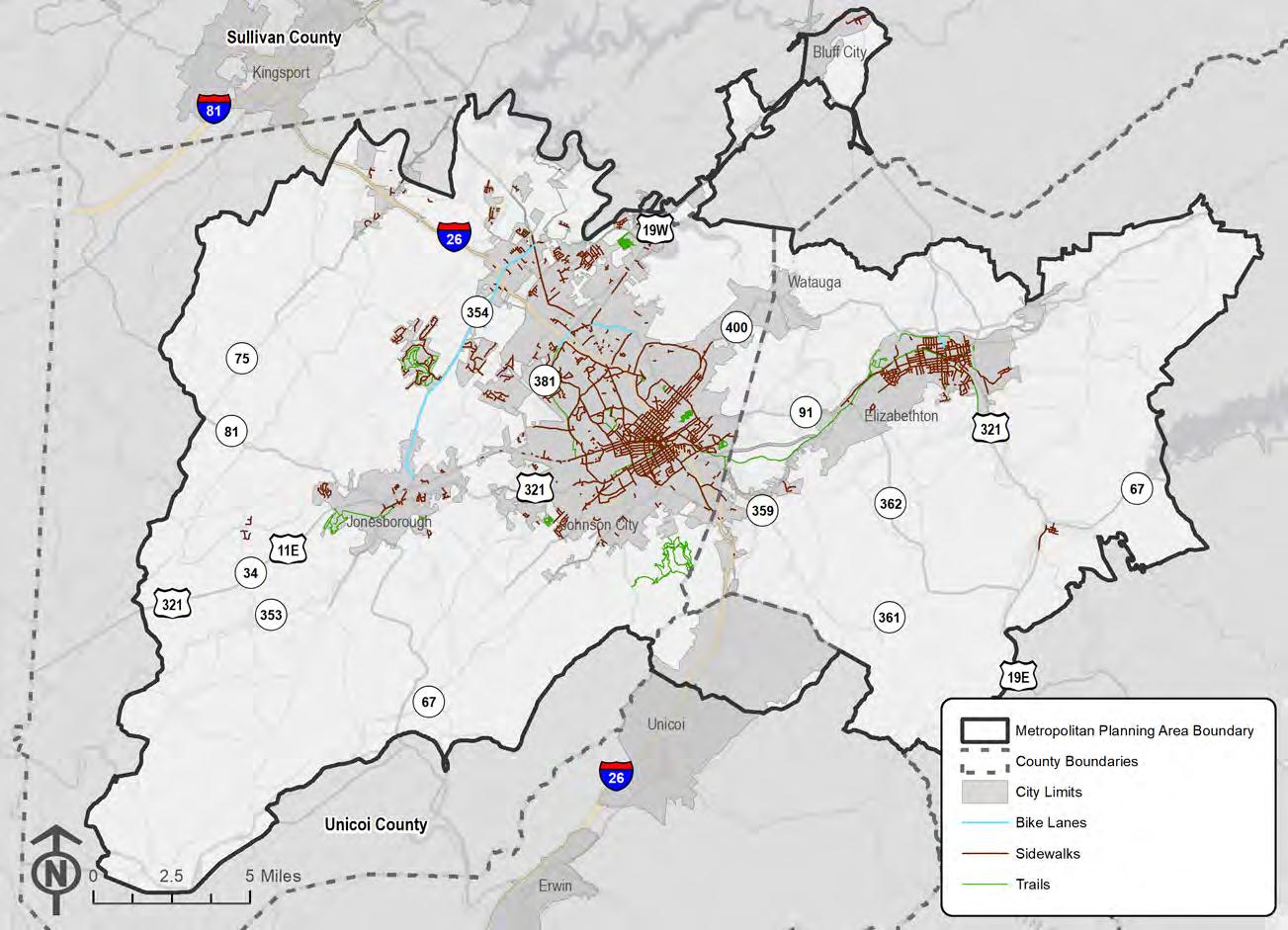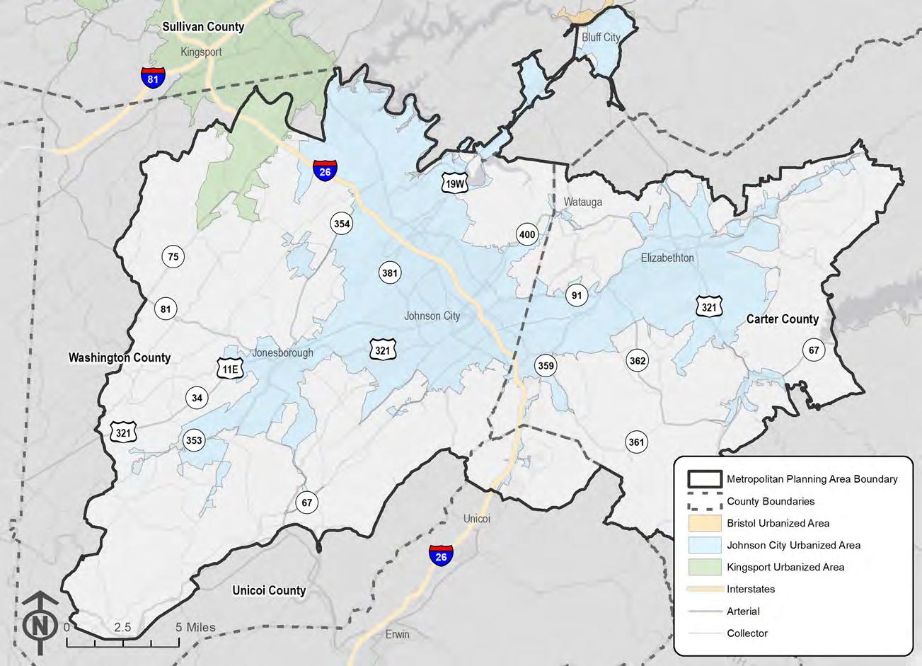 An MPO is a policy-making organization focused on transportation that is composed of local government representatives, Federal and State officials, public transit providers, and other transportation officials, as well as local engineers and planners. Urbanized areas as defined by the U.S. Census Bureau with populations greater than 50,000 people are required to have an MPO to ensure that federal transportation funding is apportioned appropriately and aligned with planning processes that meet federal and regional goals. The Johnson City MTPO plans for and approves the use of transportation funds within its planning area for highway, transit, bicycle, and pedestrian projects. The MTPO’s planning area includes the region’s urbanized area and other areas that may become urbanized in the next 20 years (Figure 1-1).
