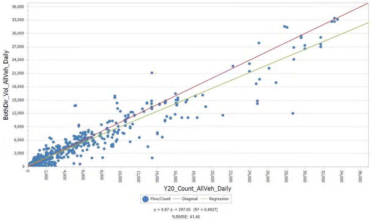 Tables 20 through 23 provide validation on the average trip lengths, percent intrazonal trips, vehicle miles traveled by roadway classification, and RSME by volume group. Figure 9 shows the coefficient of determination which estimates the correlation between the traffic counts and the model traffic volume.