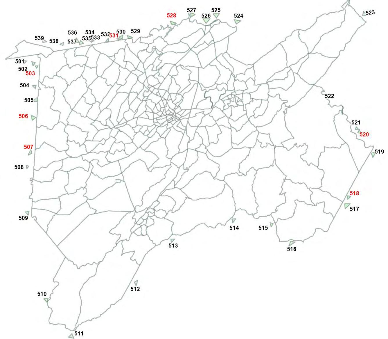 There are multiple validation checks used with each of the major steps of the model. The full model validation includes measures on VMT, percent root mean square (RMSE), R-Squared, daily volume within FHWA targets, and volumes validated with counts at screenlines. The model’s highway assignment report features validation criteria from FHWA [i.e., VMT, RMSE, R Square] and therefore no changes were made to the assignment reporting criteria within the travel demand model’s assignment reporting output to excel The screenlines were kept consistent with the previous model, and only slightly modified if a roadway link no longer had a count available. The screenline locations are shown in Figure 6