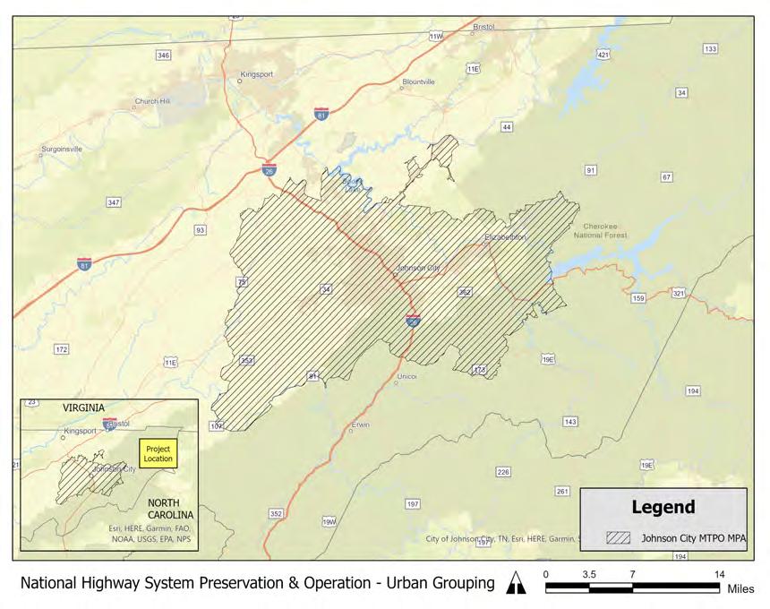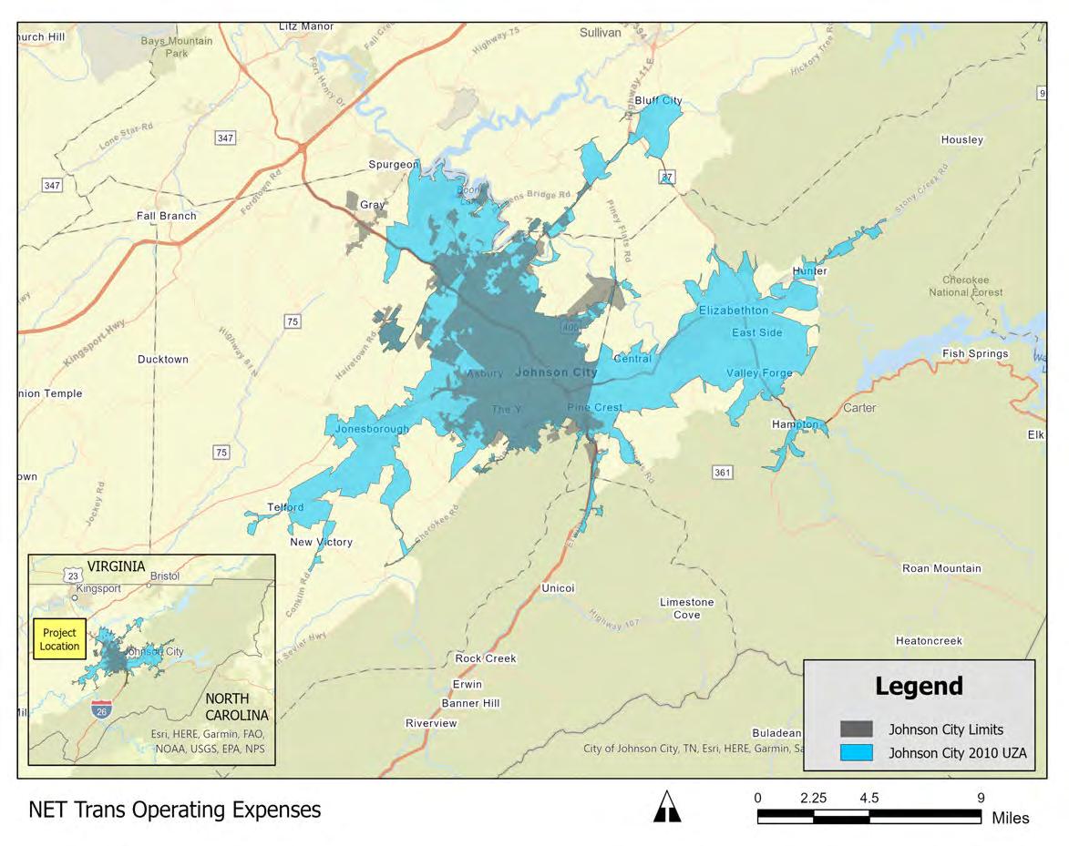 Under current federal law, at a minimum, any urbanized area (UZA) with a population over 50,000 must be in a Metropolitan Planning Area (MPA) for a Metropolitan Planning Organization (MPO). The MPA is a boundary around the urbanized area that identifies additional areas that are expected to become urbanized within the next twenty (20) years. Please note, in 2022, the Census Bureau defined areas as either rural or urban in new criteria and did away with the term urbanized area, even though the federal transportation law still refers to it. The Johnson City MTPO MPA consists of the Town of Bluff City, the City of Elizabethton, the City of Johnson City, the Town of Jonesborough, a portion of the Town of Unicoi, and parts of Carter, Sullivan and Washington Counties. The map in Figure 1 on the next page shows the Johnson City MTPO Urbanized Area, as well as the MPA boundaries. The current boundary was adopted by the Johnson City MTPO Executive Board at its meeting on October 9, 2014 and approved by the Governor of the State of Tennessee on December 17, 2014.