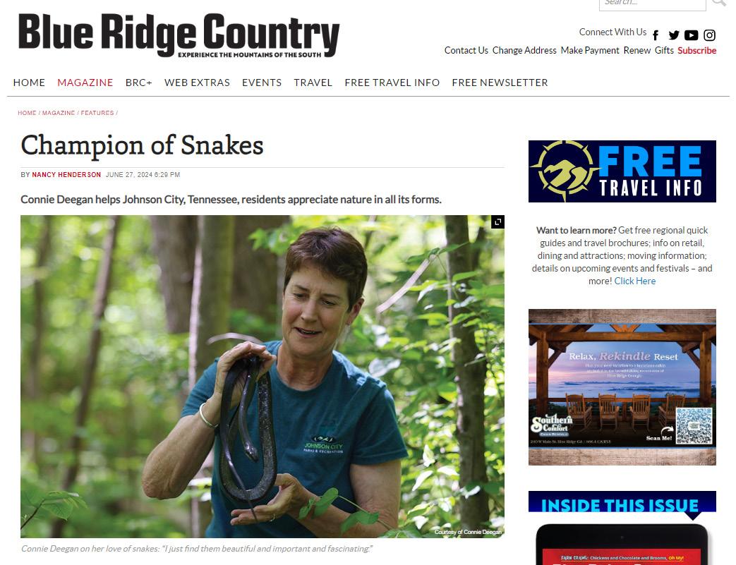 Connie Deegan, Parks and Recreation naturalist, has been featured in the latest edition of Blue Ridge Country magazine. “Champion of Snakes” by Nancy Henderson delves into Connie’s unique and impactful work with local wildlife.