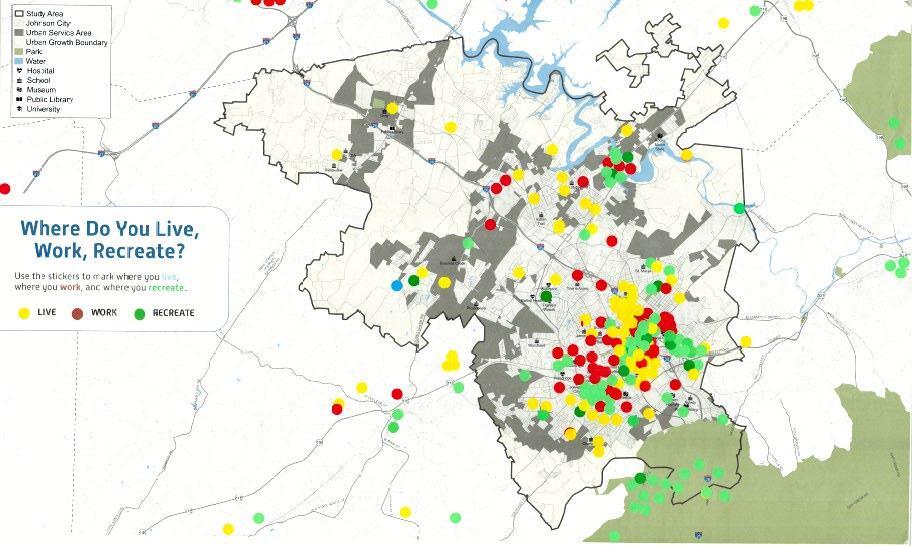 Participants used colored dots to identify locations in Johnson City they think are appropriate for different types of growth.