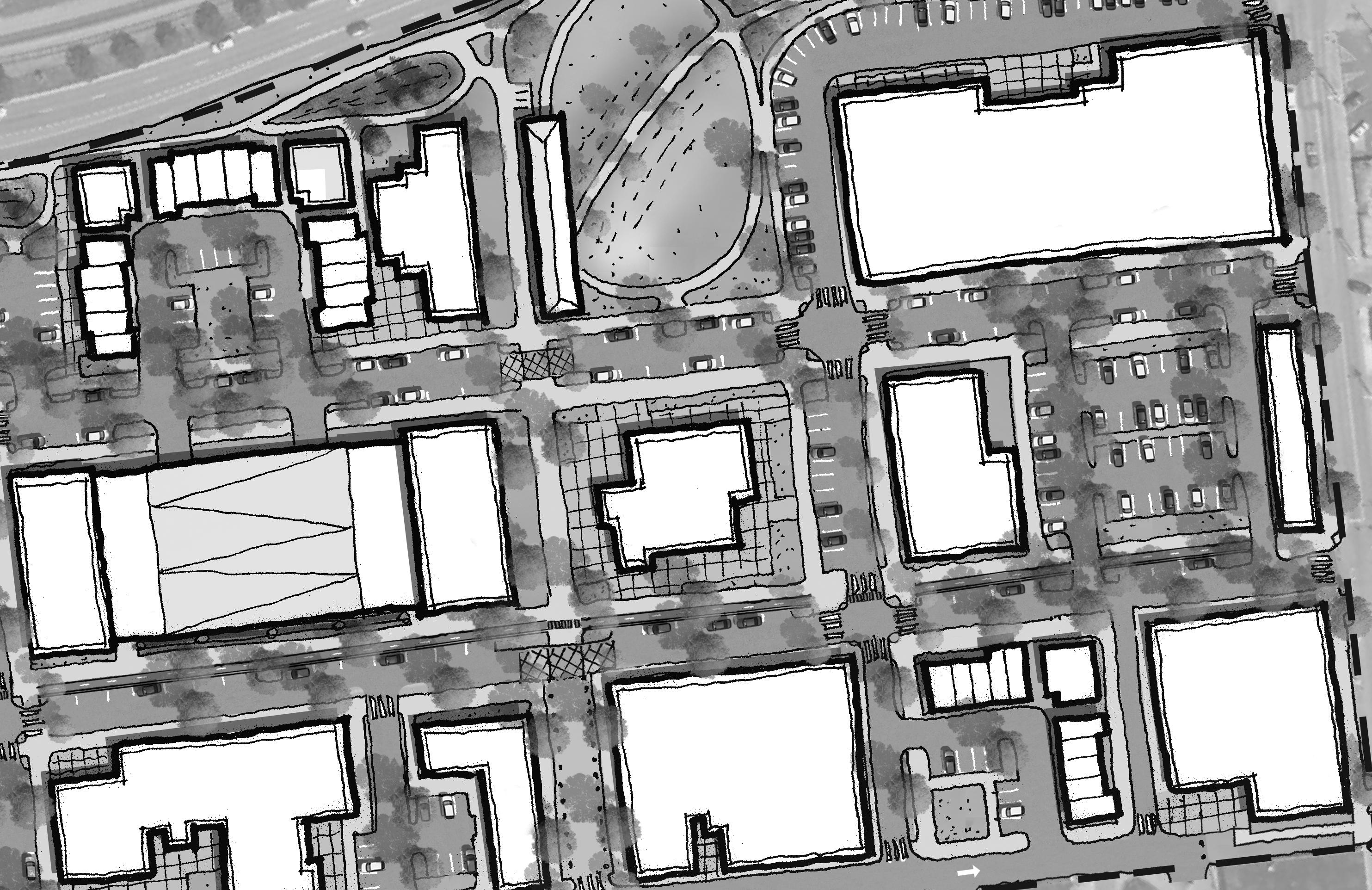 » Open Space: To coordinate with the proposed civic use and connections of this end of the corridor, a new civic green space or lawn was introduced. This space is aligned with the former post office site and creates a visual axis between Founder’s Park and the interior of the study area.