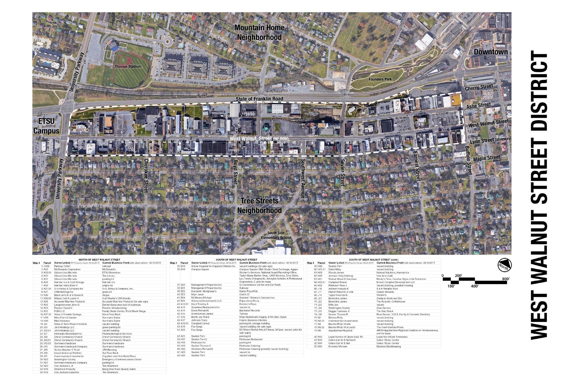 The area studied within this report is bound by State of Franklin to the north, Buffalo Street to the east, University Parkway to the west, and by Lynn Street to the south. West Walnut Street serves as the study area’s primary focus and is paralleled to the north by Ashe Street and intersected by Cherokee Street, Boyd Street, Watauga Avenue, Southwest Avenue, Sevier Street, and Earnest Street. With the exception of West Walnut Street, Sevier Avenue is the only street that enters and exits the study area.