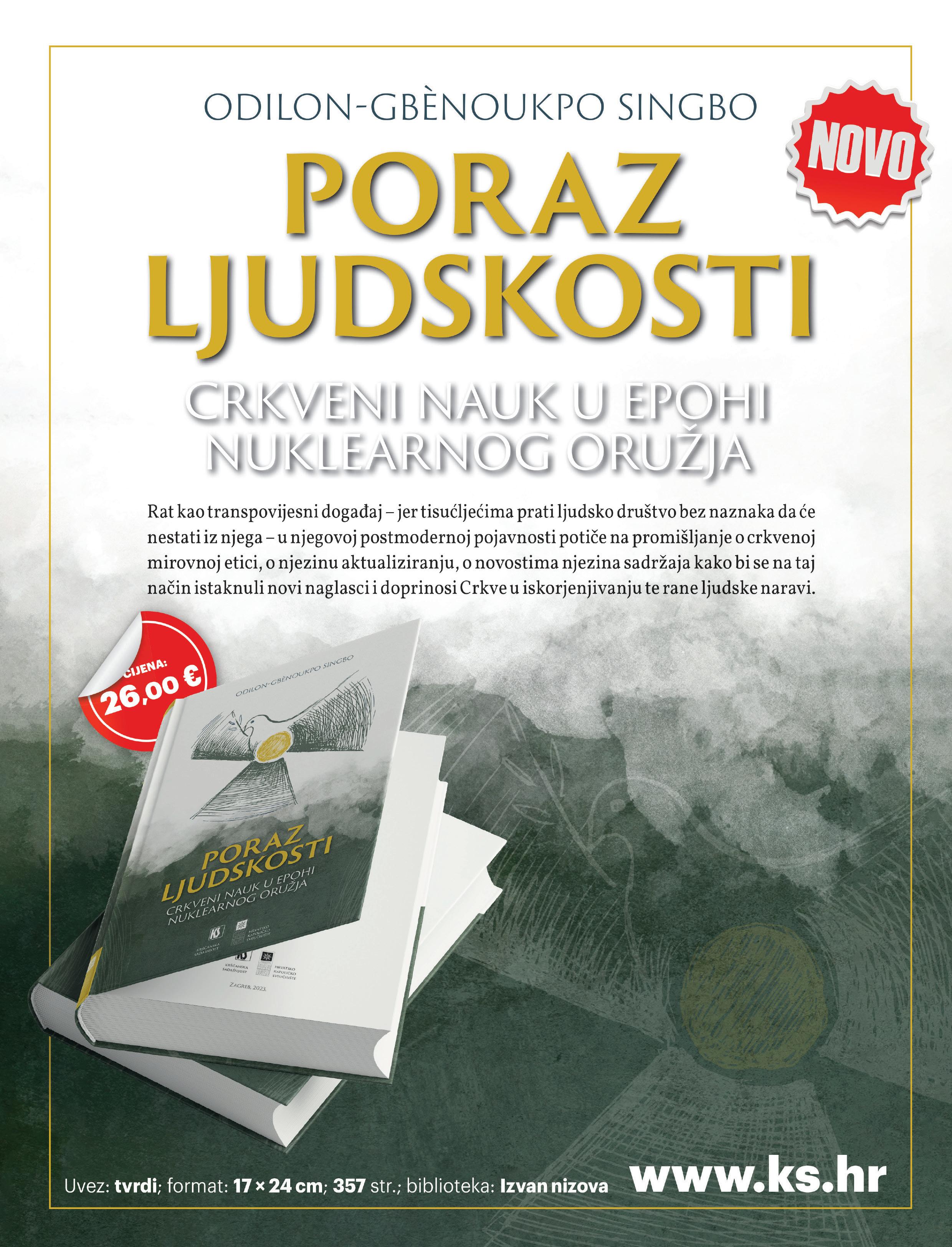 Ukrajini prije godinu dana punila je medijske prostore. No očito nemoćni dugotrajno zadržati ono početno suosjećanje i empatiju, svi se, ponajprije mediji, brzo zasitimo bilo kakve teme, pa tako i ove bolne pri čemu zaboravljamo na sve one koji su i danas, u Ukrajini ili drugim dijelovima svijeta, i dalje zarobljeni u raljama te ružne ratne stvarnosti, toga poraza ljudskosti . Upravo je tako naslovljena najnovija knjiga Odilona Gbenukpo-Singboa, u kojoj možemo saznati nešto više o crkvenom nauku o ratu, koji se razvijao kroz stanja ljudske povijesti obilježene ratovima i raznim ratnim teorijama, i o suvremenim crkvenim stavovima u novim civilizacijskim izazovima. Knjiga će vam pružiti iscrpno filozofsko, teološko promišljanje o ljudskoj naravi u ovoj našoj epohi straha od »apokaliptičkog čudovišta« te o paradigmama koje oblikuju naše društvo te je, uz našu Kanu, svakako preporučujem kao nezaobilazno štivo.