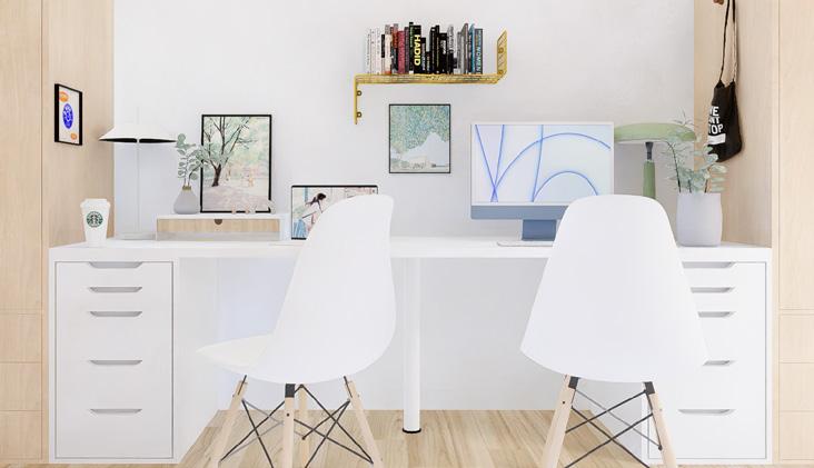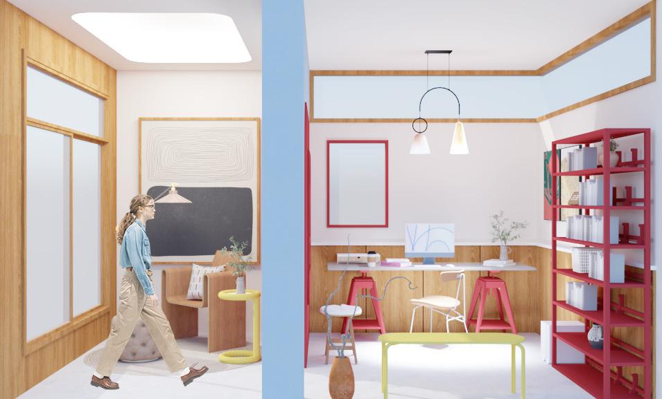 CONCEPT : The studio must be an area where we can work efficiently. Which consists of the environment in the room that affects perception and feeling, the use of cream colors that are bright tones, the selection of wood materials to feel warm and relaxed, and the selection of the upper opening for privacy. but still receives natural light and makes the room look more airy. And most importantly, good work must be accompanied by good rest. Therefore, we divided the zone for a resting area on the entrance side. The side has a large opening. To connect with nature outside You can sit and read a book and enjoy the view by choosing a Mid-Century Modern-style decoration that emphasizes the use of simple geometric shapes but has dimension in the use of different materials and colors.