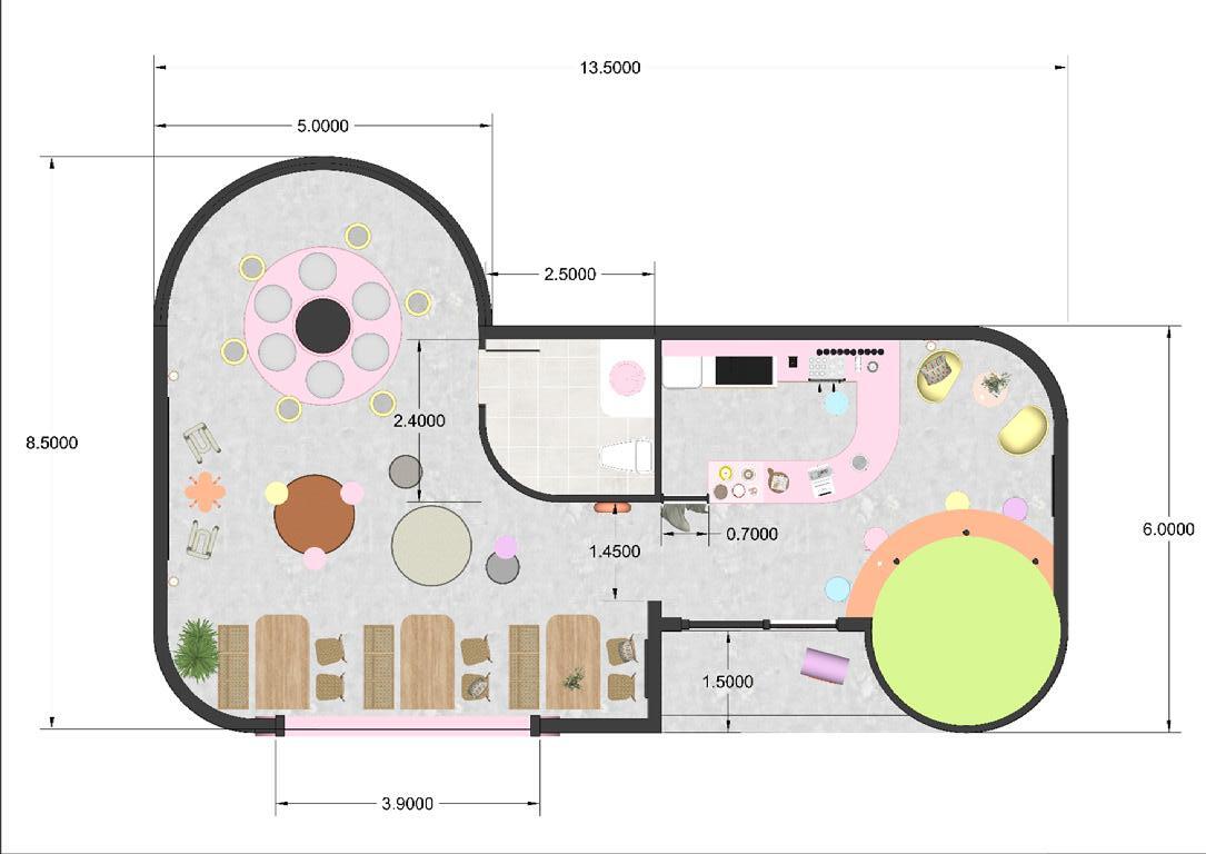 CONCEPT : A dessert cafe is designed with curved lines that are friendly when looking from the outside or entering the space inside. And to connect the space with people into a continuous space by using lines, whether it be walls or designing built-in furniture that matches the space. Including selecting and arranging floating furniture appropriately in each zone. The mood and tone design uses soft pastel colors. Contrasted with light wood materials. It is a natural material that gives a feeling of friendliness and makes green space look lively. more relaxed It’s a small gimmick to sit and drink coffee.