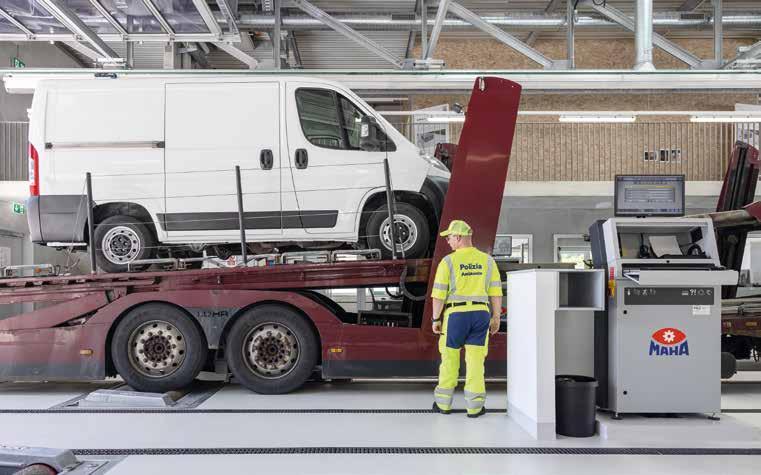 Als Teil der Prüfstrasse wurde der Radlauftester MAHA MINC II EURO integriert. Er misst bei der Überfahrt in Sekundenschnelle die Achsgeometrie und zeigt Abweichungen des Geradeauslaufs Meter/Kilometer.