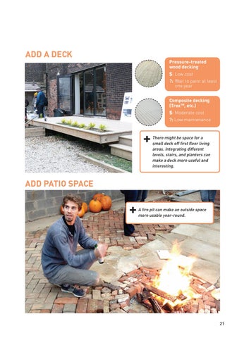 There might be space for a small deck off first floor living areas. Integrating different levels, stairs, and planters can make a deck more useful and interesting.
