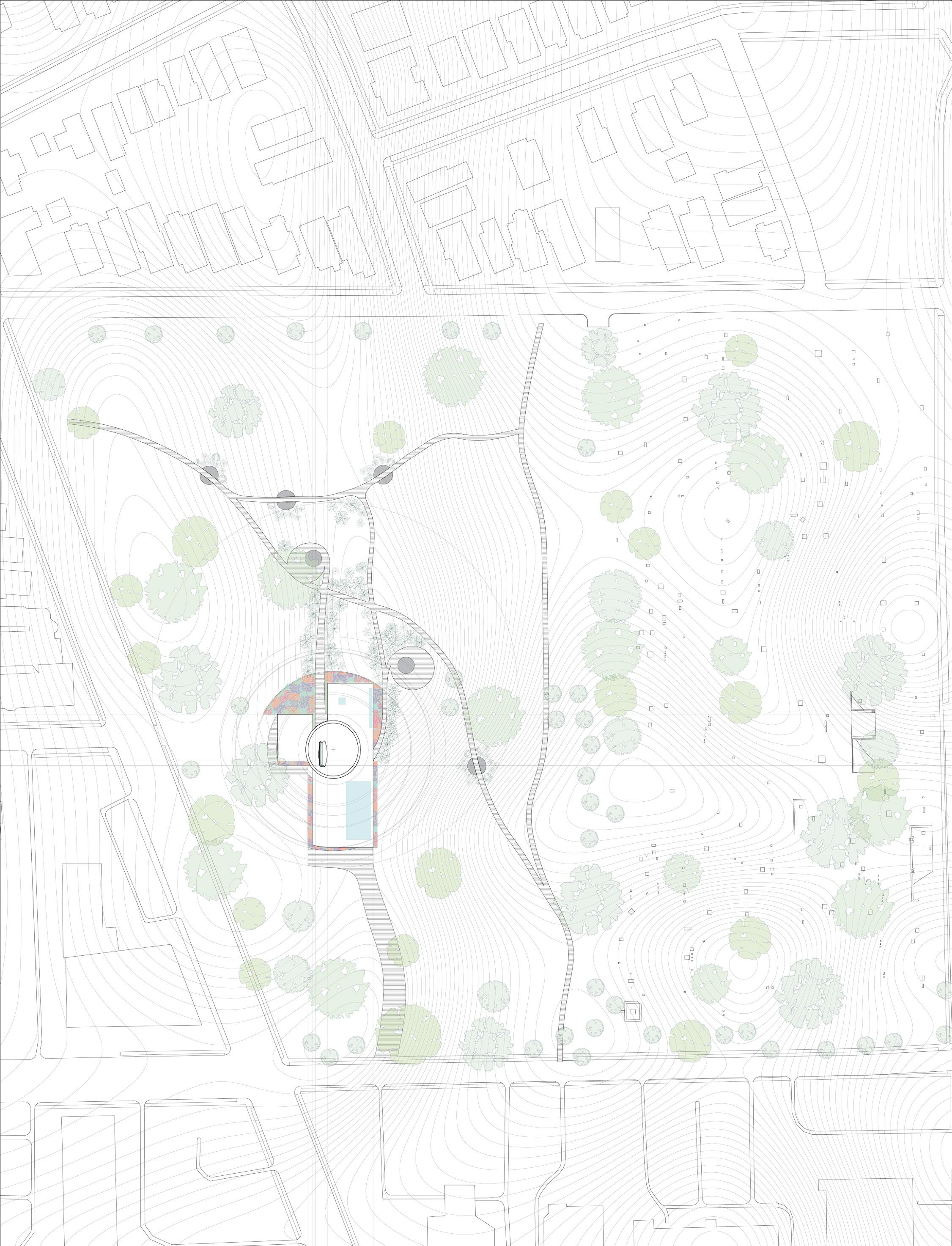 This facility prioritizes serenity and harmony through strategic use of light, featuring openings in the roof and sides to facilitate a calming atmosphere. Situated in the lower-middle part of the site, the facility integrates seamlessly with pedestrian flow, enhancing public accessibility. Landscaping, aligned with structural geometries, enhances the overall design, including a composting greenhouse and meditation area. External landscaping defines paths leading to inviting pockets of space. The structure’s internal layout emphasizes a clear division between public spaces, such as the meditation and contemplation areas, and private spaces, including labs and offices, strategically located for practical considerations like soil and body transportation.