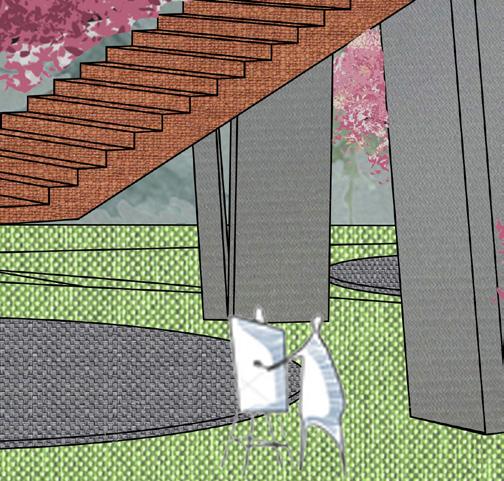 Taking inspiration from architects like Frei Otto and Shigeru Ban, the design of my project consists of an overarching canopy structure that transforms from rigid to fluid as one moves from left to right throughout the site. The canopy is supported by trunk-like pillars and programming blocks which are constricted to the left side of the project, corresponding to the language of the canopy. These pillars also integrate essential circulatory elements, including fire stairs and elevators. The upper levels ramp up towards the canopy and extend outward towards the event space, creating a cohesive and expansive environment while enhancing the sense of space and community interaction. Many design choices in this project embody the principle of multifunctionality, resonating with the language of Frogtown and the LA river.