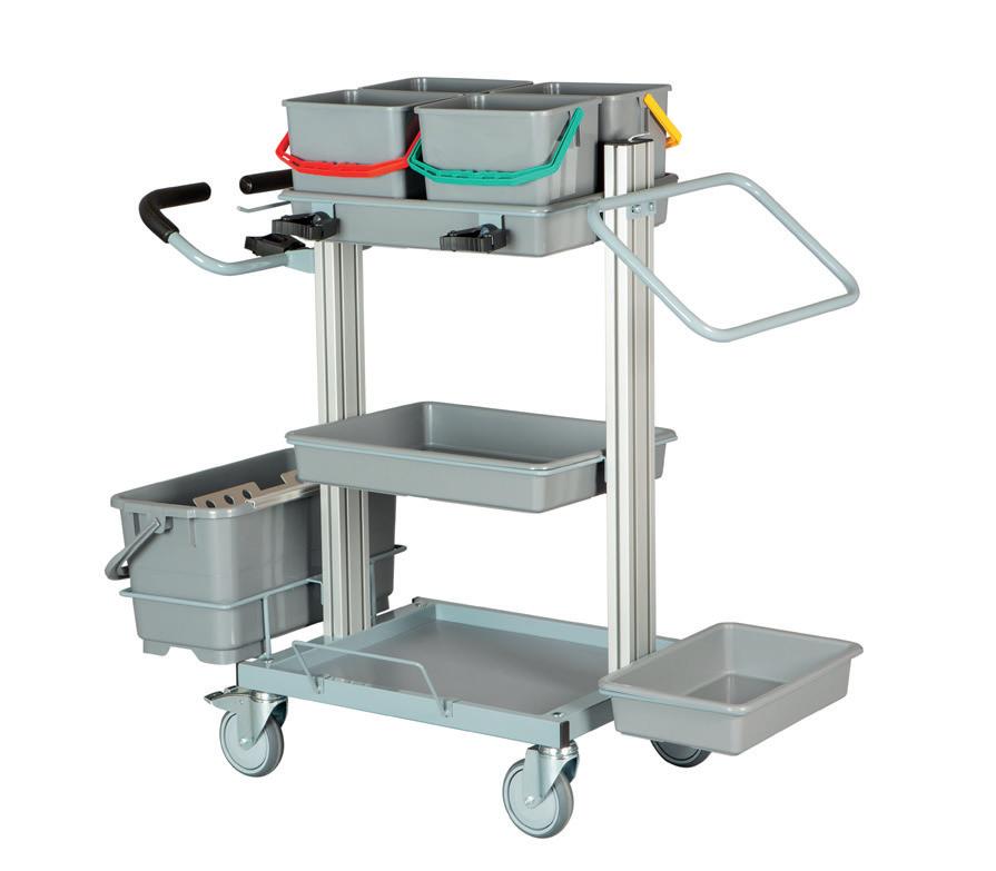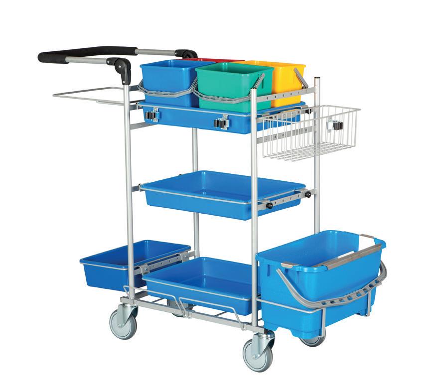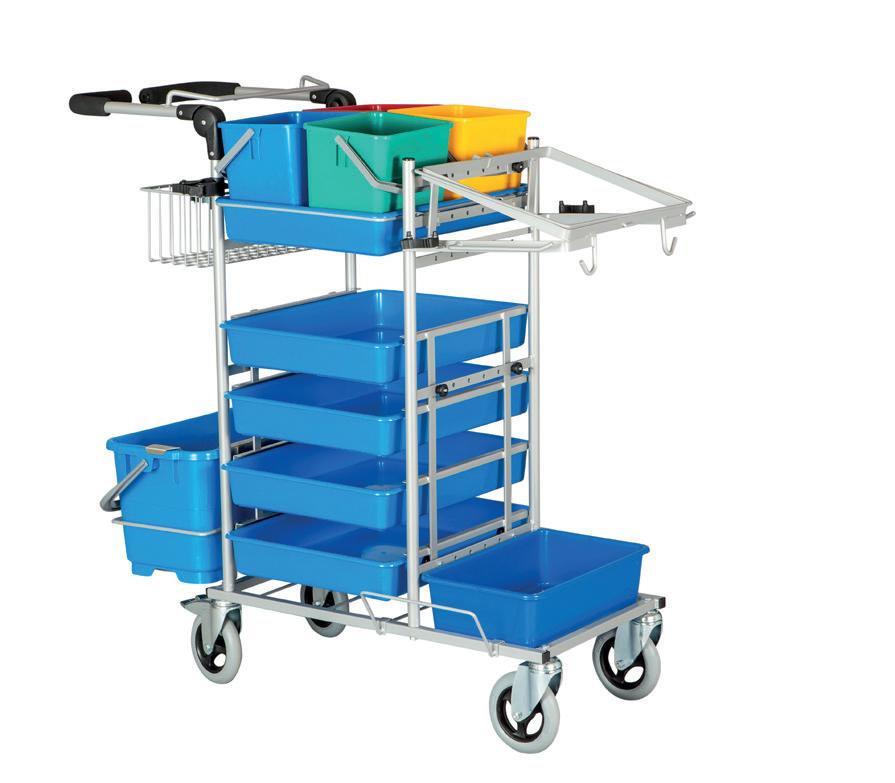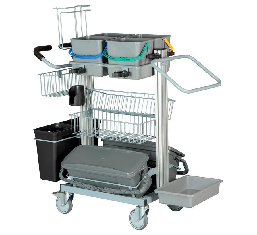 Denne vogn hører under kategorien Ergo Slimline. Til vognen medfølger 1 stk. plastbakke, hvori der sidder 2 stk. 6 ltr. spand. Yderligere medfølger 2 stk. plastbakke til diverse, 1 stk. stort 110 ltr. affaldsstativ med redskabshold samt 1 stk. redskabs- & mopholder. Bundpladen kan med fordel anvendes til småopbevaring.