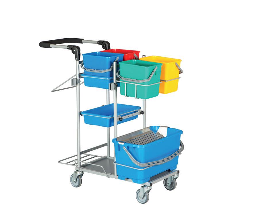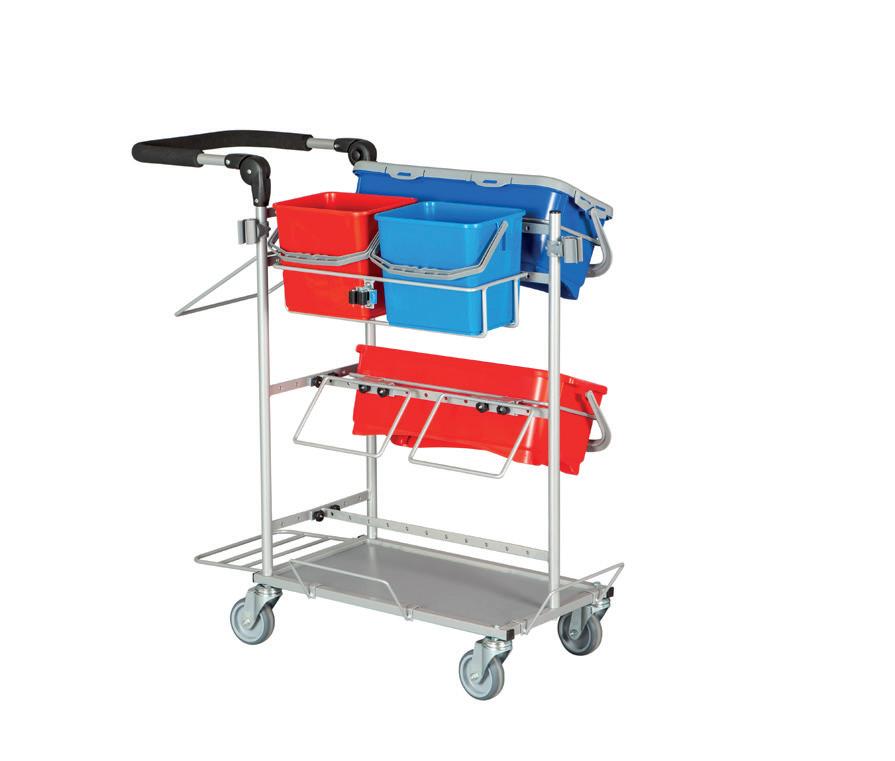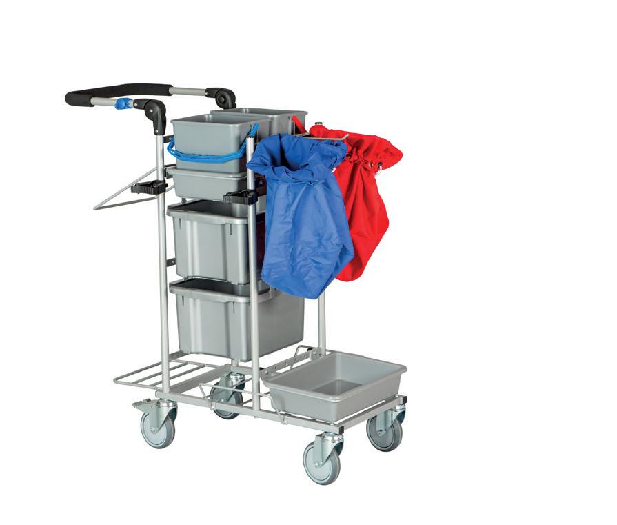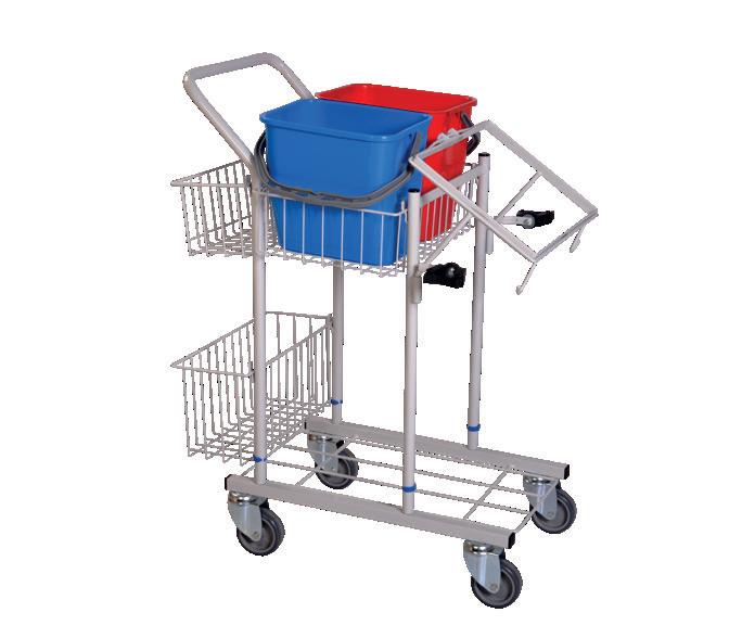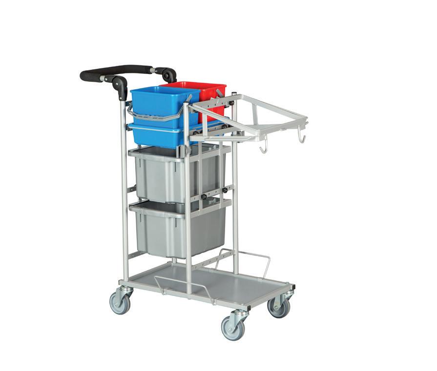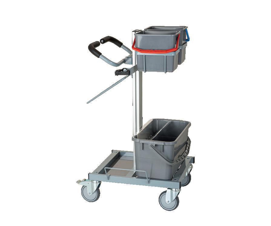 Denne vogn hører under kategorien Ergo Slimline. Med sine 40 x 40 cm. på bundrammen fylder vognen minimalt, når håndtaget er foldet ned. Til vognen medfølger 2 stk. 6 ltr. spand & mery spand, hvortil der er redskabsholder imellem spandene.