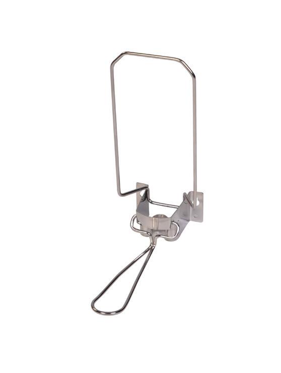 Holderen, der er produceret i rustfri stål, er udformet til 600 ml. pumpeflaske, men kan sagtens passe andre flasker også. Toppen er to-delt med mulighed for fastgørelse af lås for at undgå tyveri eller fjernelse af spritflasken.