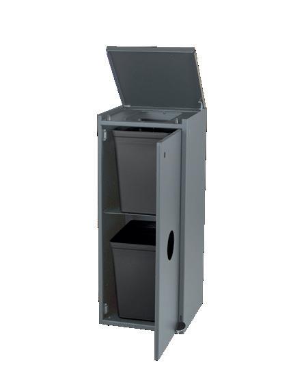 Bakkestativ til indsamling af bakker og service. 2 x Indkast for oven. 2 stk. 10 ltr. plastbeholder i 100 % genbrugsplast medfølger.