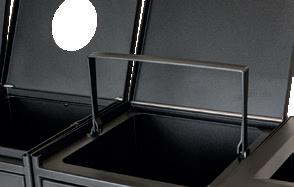 Beholderen er produceret med et hul i hver side, til sammenkobling med en eller flere beholdere. Hvert enkelt leveres med stilleskruer, som nemt kan erstattes med hjul, hvis dette ønskes. Yderligere åbnes beholderen i fronten, så tunge løft undgås ved tømning og lågen holdes lukket med magnet.