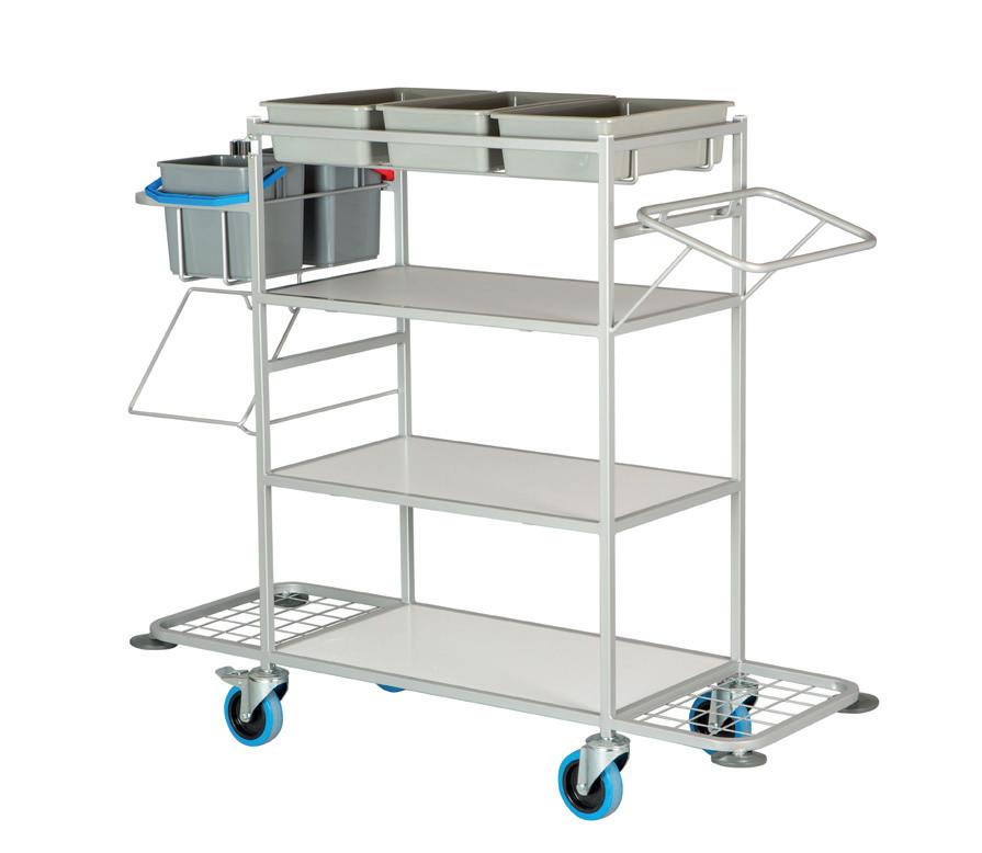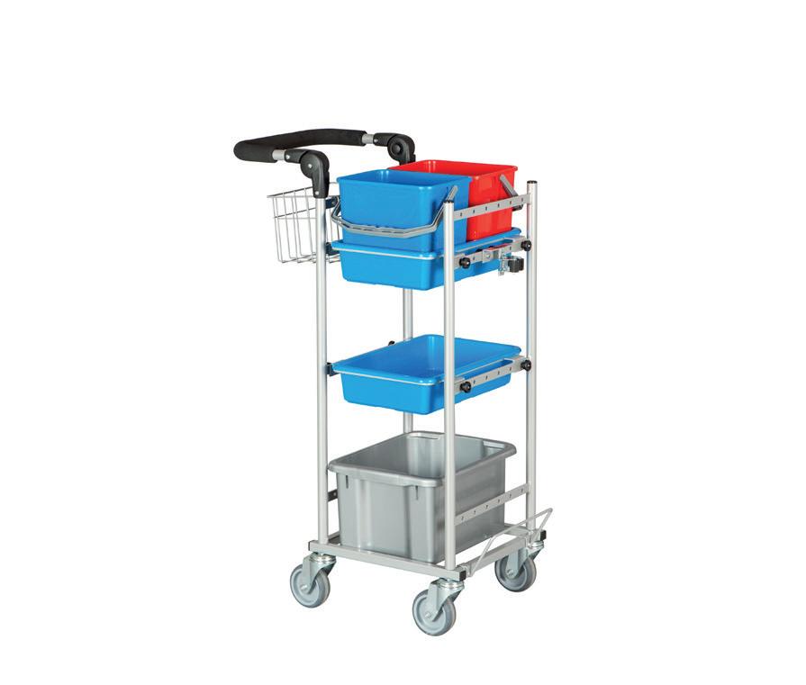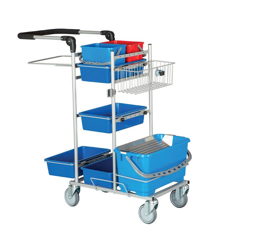 The trolley is supplied with 1 tray containing 2 pcs. 6-litre buckets, 2 mop boxes & a small basket for miscellaneous items.