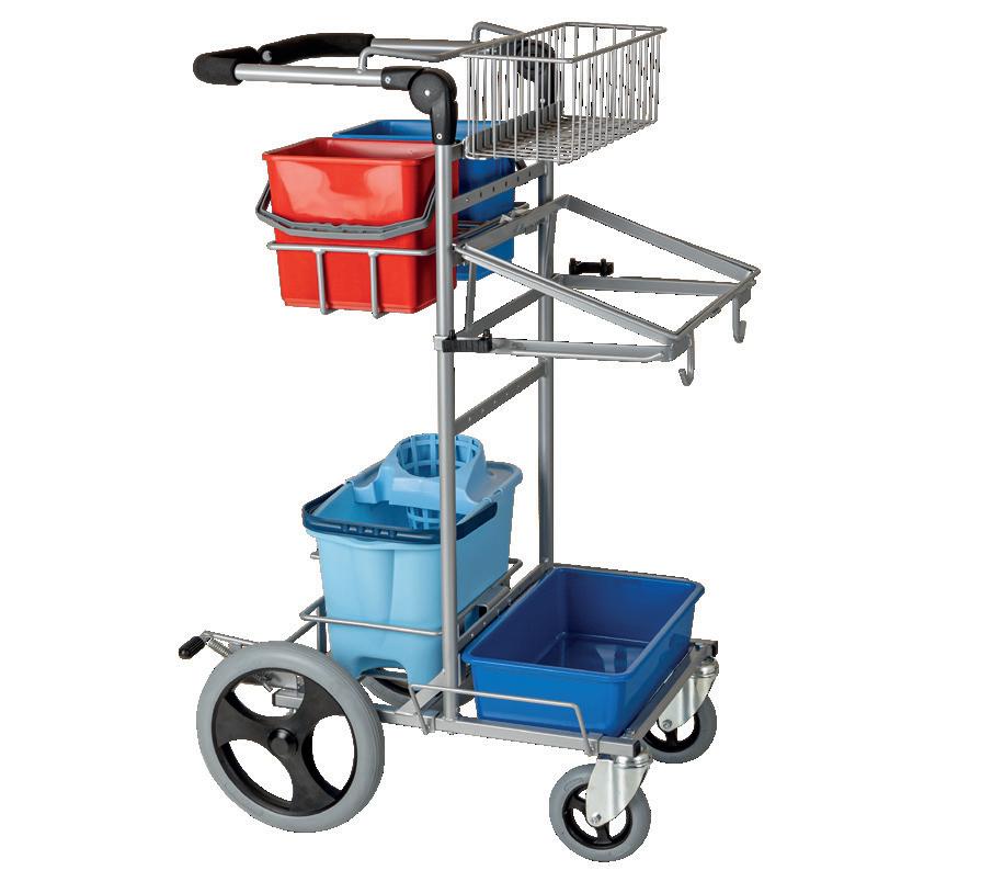 This trolley falls under the Ergo Slimline category. The trolley is supplied with 1 tray containing 2 pcs. 6-litre buckets, 2 mop boxes, 1 large basket & 1 small basket. The large basket can be used as a small waste holder. Is also supplied with a three-pronged hook, 2 tool holders & 1 mop holder.