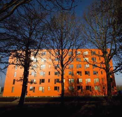 Den orangefarvede bygning rummer 153 studielejligheder, der udelukkende er opvarmet med overskudsvarme fra spildevand.