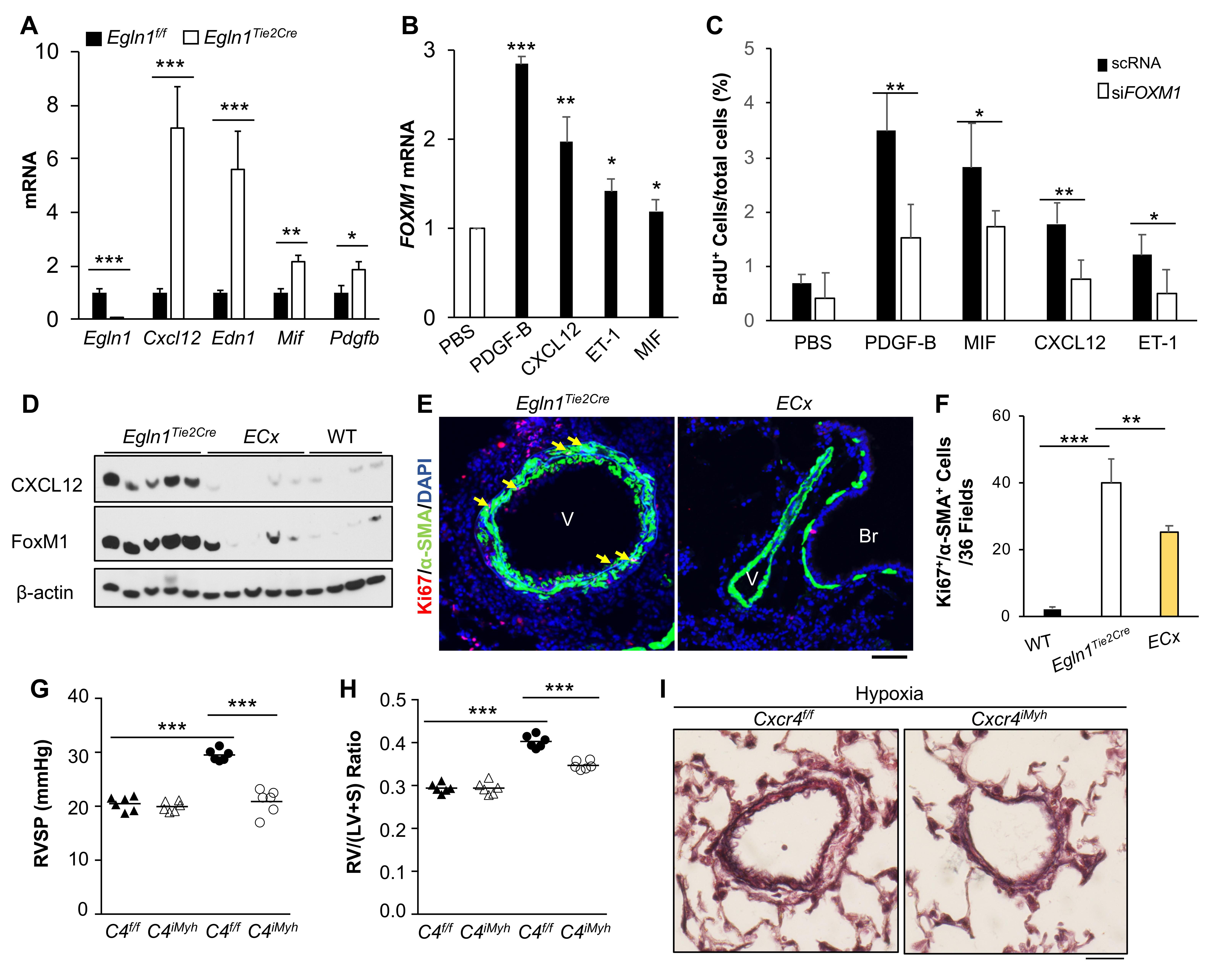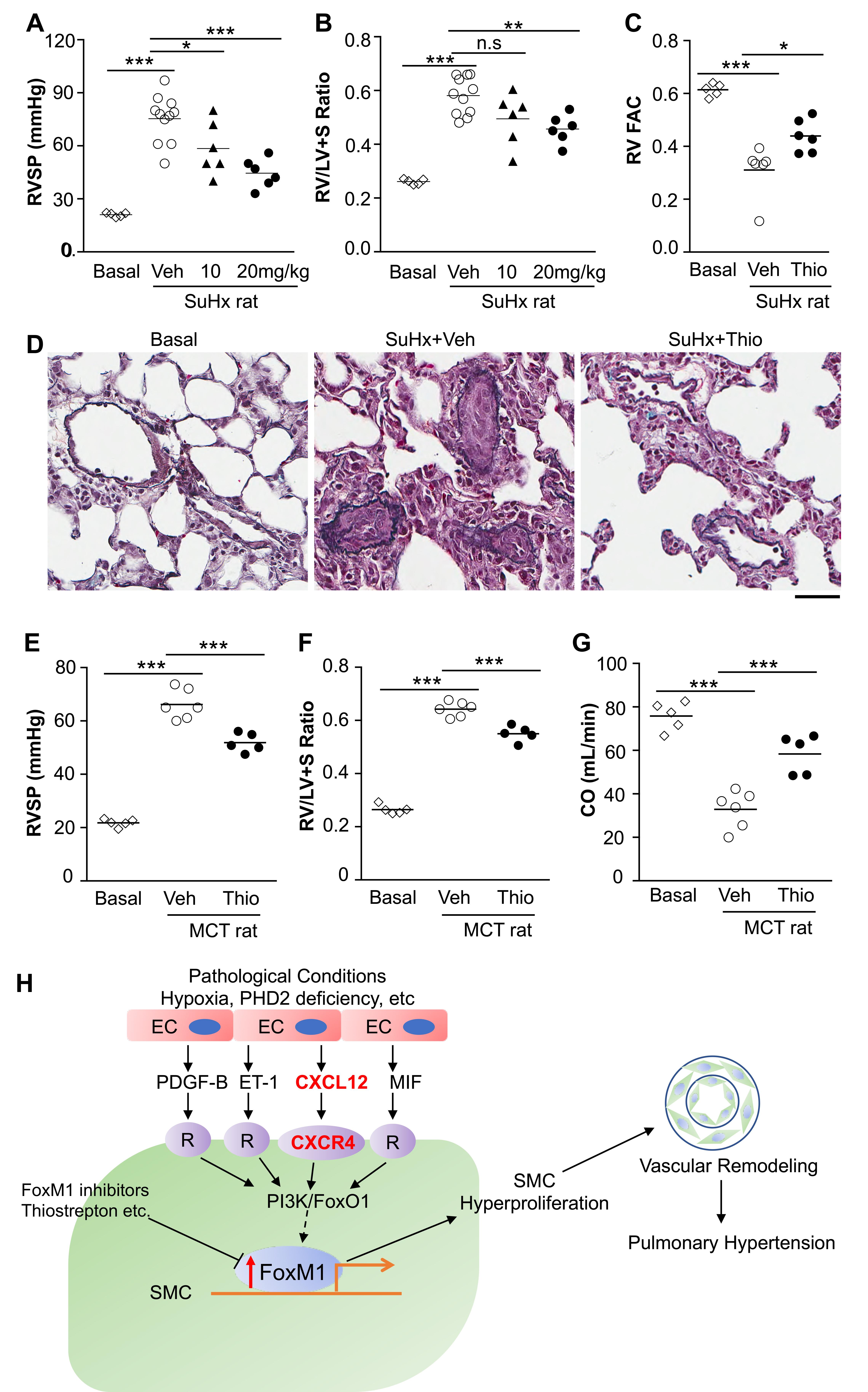 Background: SMC-specific FoxM1 or Cxcr4 knockout mice, EC-specific FoxM1 or Egln1 knockout mice, as well as EC-specific Egln1/Cxcl12 double knockout mice were used to assess the role of FoxM1 on SMC proliferation and pulmonary hypertension (PH). Lung tissues and cells from PAH patients were employed to validate clinical relevance. FoxM1 inhibitor Thiostrepton was used in Sugen 5416/ hypoxia- and monocrotaline-challenged rats.