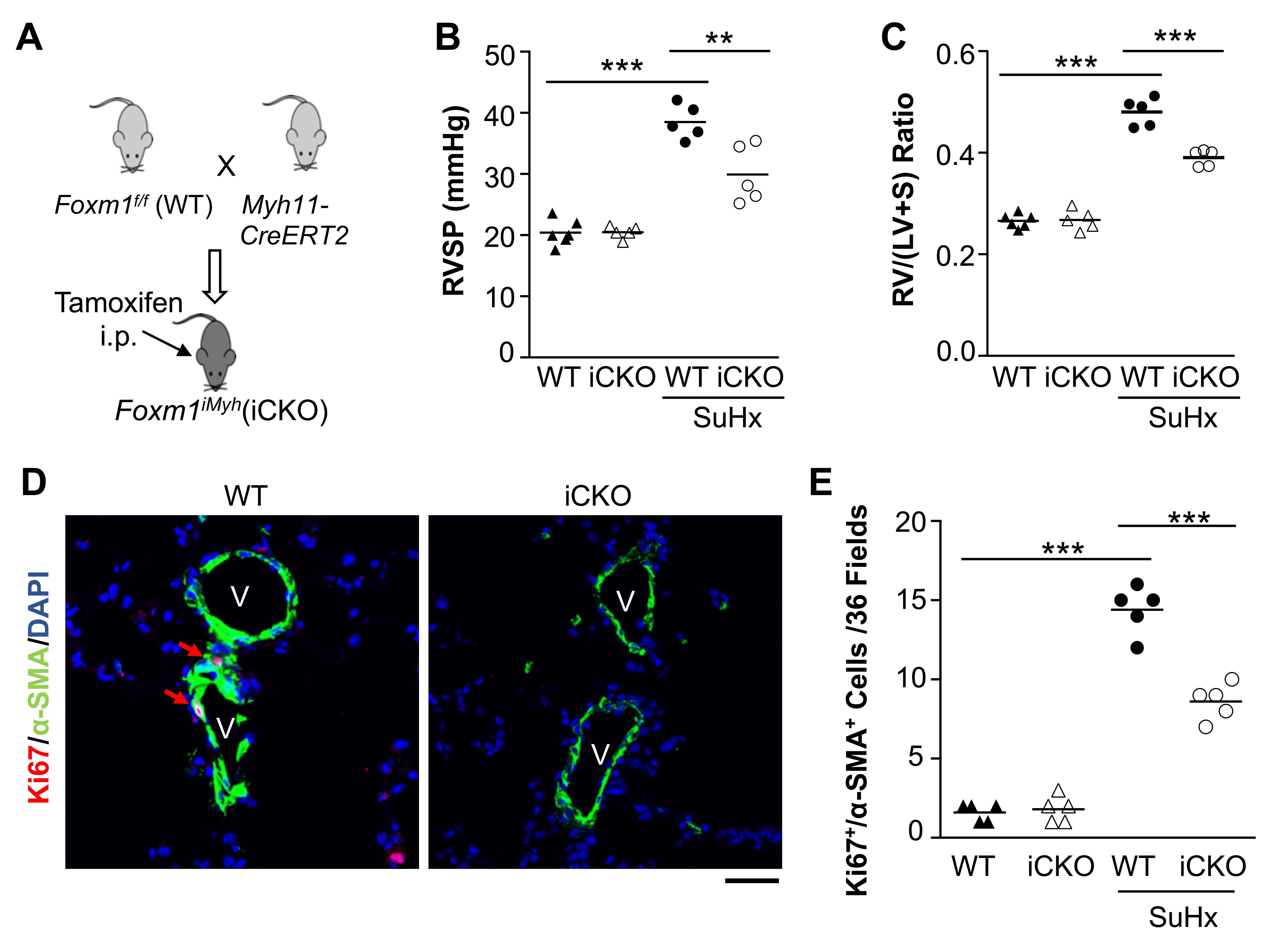 Figure 1: FoxM1 disruption in SMCs inhibits SuHx-induced PH in mice. Figure 2: Foxm1 disruption in SMCs inhibits SuHx-induced PH in mice