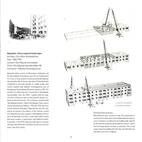 Navestad - Silverringen & Guldringen Architect: Eric Ahlin Arkitektkontor Year: 1968-1972 Location: Norrköping municipality Client: Norrköpings Hyresbostäder AB Contractor: Skånska Cementgjuteriet Navestad, which consists of Silverringen, Guldringen and the low-buildings Atriumhusen, was the last development of a series of large projects commissioned by Norrköpings Hyresbostäder AB. Its director was Karl-Erik Anebäck who established a very early example of a public-private joint venture together with Skånska Cementgjuteriet, part of Norrköpings Elementfabrik AB which opened in 1965. The architect Eric Ahlin had been closely tied to Norrköpings Hyresbostäder since the 1940’s. Together with the engineer Arne Johnson he was commissioned to design a rational construction process. The result was a system called ‘Norrköpingsmetoden’, System Norrköping. It was used in