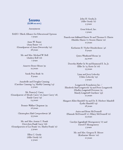 Lynn and Jerry Lehocky (Chloe Lehocky ’19) 5 years Longstreth Foundation Inc. / Elizabeth Steel Longstreth ’63 and Peter Longstreth (Hadley Longstreth Peterson ’91, Mandy Longstreth Gardiner ’93) 12 years Margaret Klein Mandell ’69 and Dr. E. Herbert Mandell (Lydia Mandell ’03) 18 years