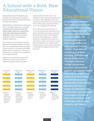 A School with a Bold, New Educational Vision Springside Chestnut Hill Academy was founded in 2011 following the merger of two historic schools, Springside School and Chestnut Hill Academy. SCH Academy’s comprehensive and rigorous Pre-K–12 college preparatory curriculum is driven by a 21st century vision of what today’s students need and is supported by nearly 300 combined years of academic leadership in boys’ and girls’ education, enabling us to offer an unparalleled academic experience. Our structure of one school-five divisions, described in the graphic below, expresses both our continued commitment to gendertailored education in the lower and middle grades and our recognition of the value of coeducation in a student’s final preparation for college and beyond.