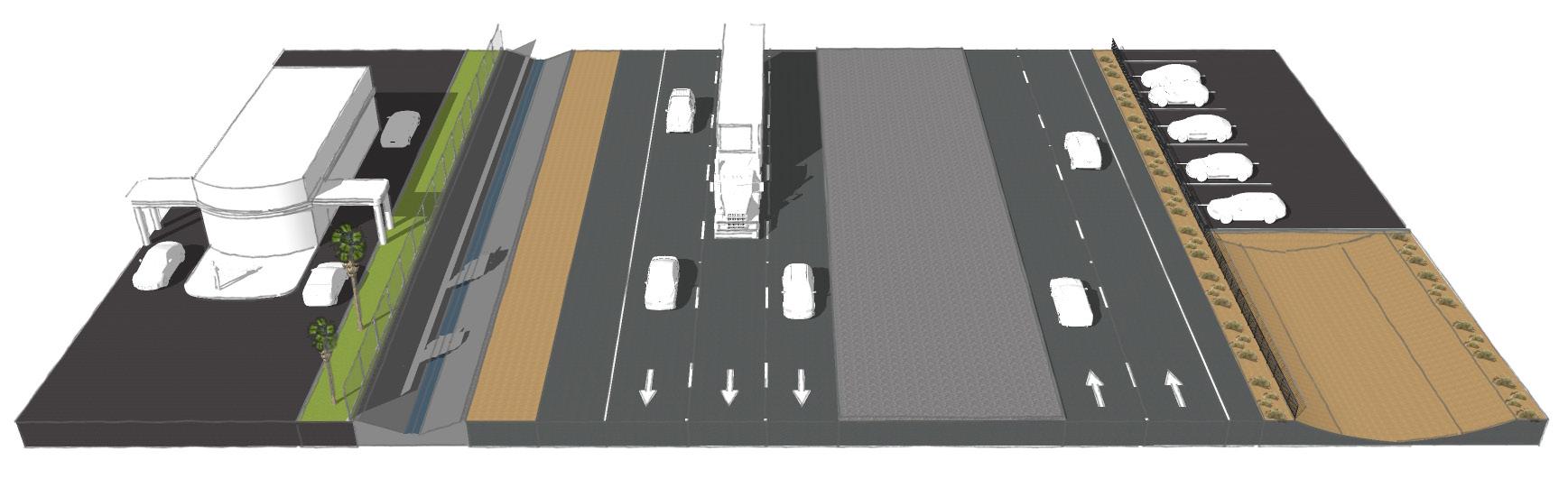 Segment B is characterized by a frontage road on the west side, a mixture of raised and earthen medians, and a lack of sidewalks.