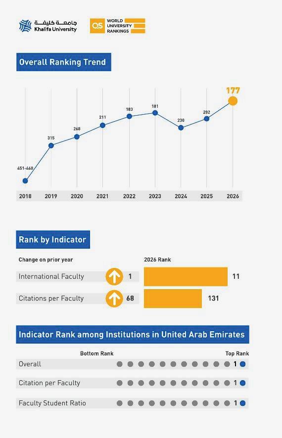 Khalifa University has jumped 25 places to be ranked 177th globally in the QS World University Rankings 2026, firmly securing a spot among the world’s top 200 universities.