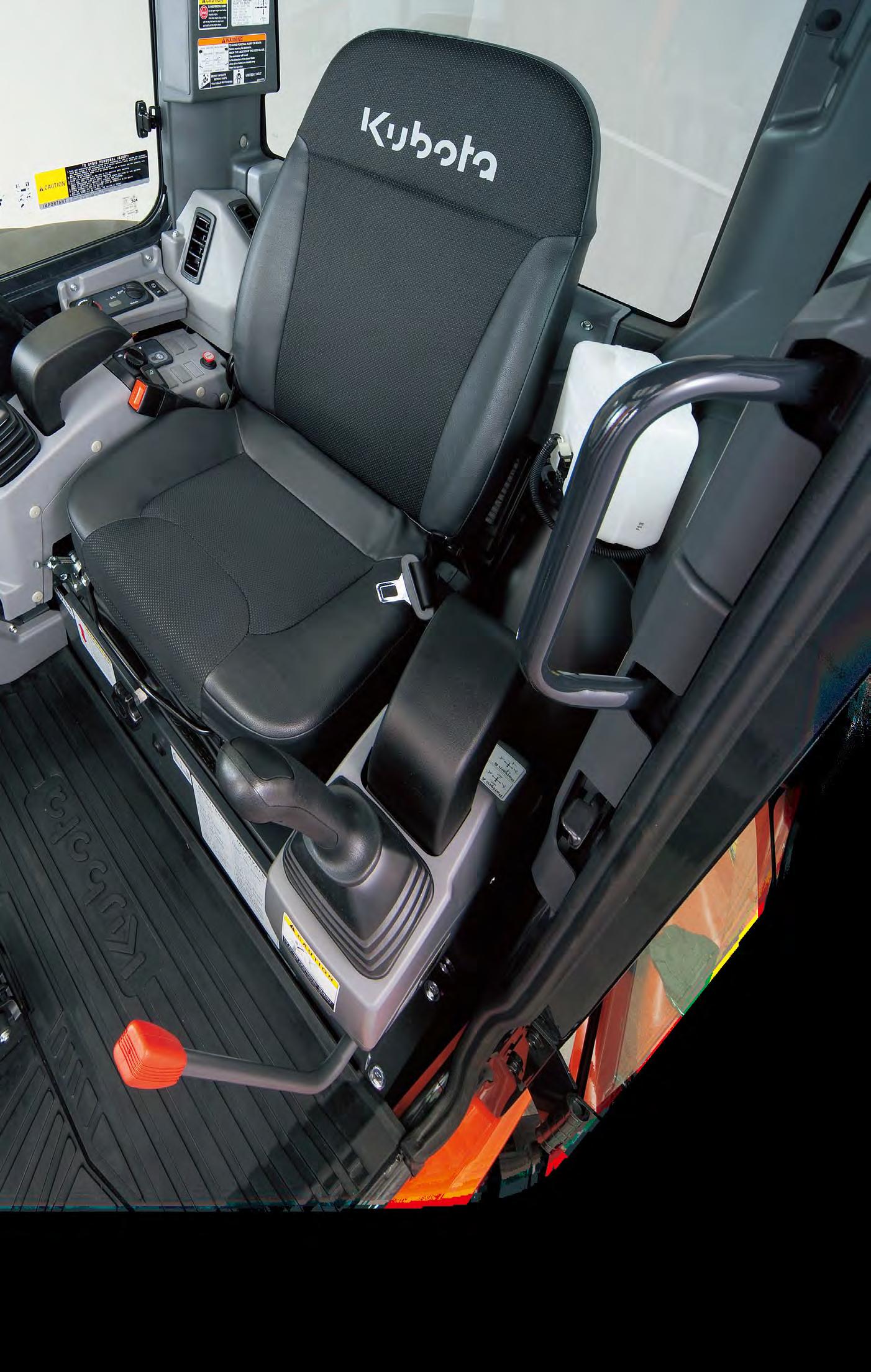 Kubota’s high back suspension seat has been designed for maximum operator comfort and to minimize fatigue during extended machine operation. The deluxe reclining seat offers weight compensation, firm adjustable wrist support and retractable seat belts.