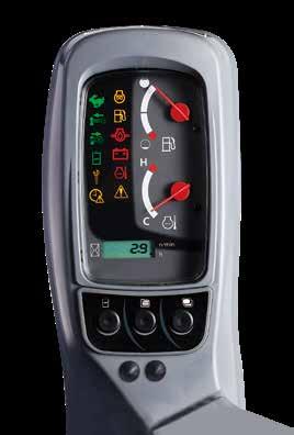 The new user-friendly front meter panel puts convenience at your fingertips. Positioned to the front right corner of the operator for better visibility and accessibility, it features easy one-touch button operation to view the time, hour meter, and tachometer. Warning lamps with codes on the display will alert you of machine conditions such as overheating, hydraulic system monitoring, or a low battery.