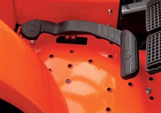 To further enhance access and entry/exit, the PTO lever is located on the right side of the operator’s seat (HST models), or to the right side of the foot platform center cover (geardrive models).