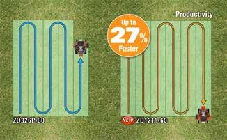 The ZD Series’ feature a low center of gravity to help improve the weight/balance and provides stablity on slopes and uneven ground. When combined with the ZD Series’ long wheelbase wide, large-diameter rear tires, and fuel tanks mounted above the tires and below the seat, the result is outstanding stability on a variety of terrains.