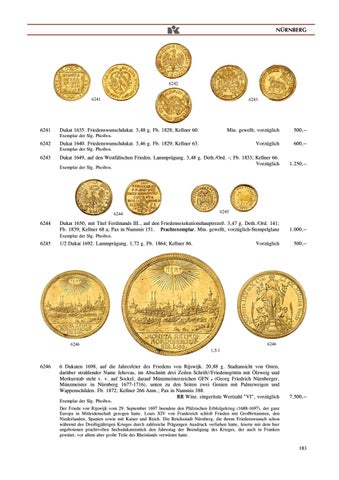 6 Dukaten 1698, auf die Jahresfeier des Friedens von Rijswijk. 20,88 g. Stadtansicht von Osten, darĂźber strahlender Name Jehovas, im Abschnitt drei Zeilen Schrift//FriedensgĂśttin mit Ă–lzweig und Merkurstab steht v. v. auf Sockel, darauf MĂźnzmeisterzeichen GFN Ăœ (Georg Friedrich NĂźrnberger, MĂźnzmeister in NĂźrnberg 1677-1716), unten zu den Seiten zwei Genien mit Palmzweigen und Wappenschilden. Fb. 1872; Kellner 266 Anm.; Pax in Nummis 388. RR Winz. eingeritzte Wertzahl "VI", vorzĂźglich Exemplar der Slg. Phoibos.
