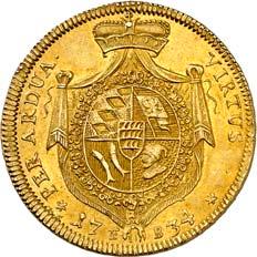 20631/4 Karolin 1735, Stuttgart. 2,42 g. Typ 4 (Brustbild im Harnisch mit Vlieskette, schmaler Hermelinmantel an der rechten Schulter sichtbar). Ohne Stempelschneidersignatur auf der Vorderseite. Geharnischtes Brustbild r. mit umgelegtem Mantel und der Kette des Ordens vom Goldenen Vlies//Vierfeldiges Wappen (Teck, Reichssturmfahne/Mömpelgard, Heidenheim) mit Mittelschild von Württemberg, umher die Kette des Ordens vom Goldenen Vlies, auf gekröntem Wappenmantel, unten die geteilte Signatur F - B (Johann Friedrich Breuer bzw. Breyer, Münzmeister in Stuttgart 1734-1738) zwischen der geteilten Jahreszahl Û 17 - 35 Û. Mit Laubrand. Fb. 3591; Klein/Raff 180 a. GOLD. Selten in dieser Erhaltung. Prachtexemplar mit herrlicher Goldtönung. Vorzüglich-Stempelglanz1.000,-Exemplar der Auktion Meister & Sonntag 7, Stuttgart 2009, Nr. 1180.