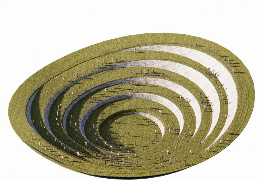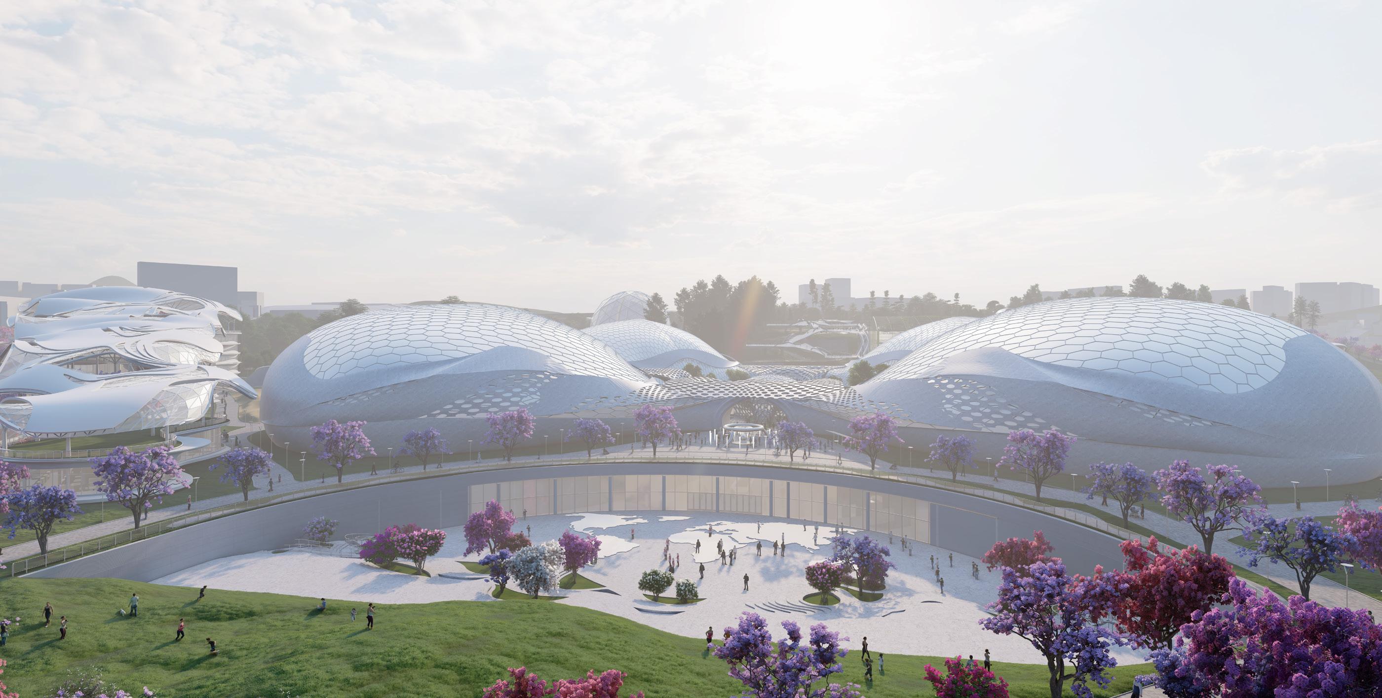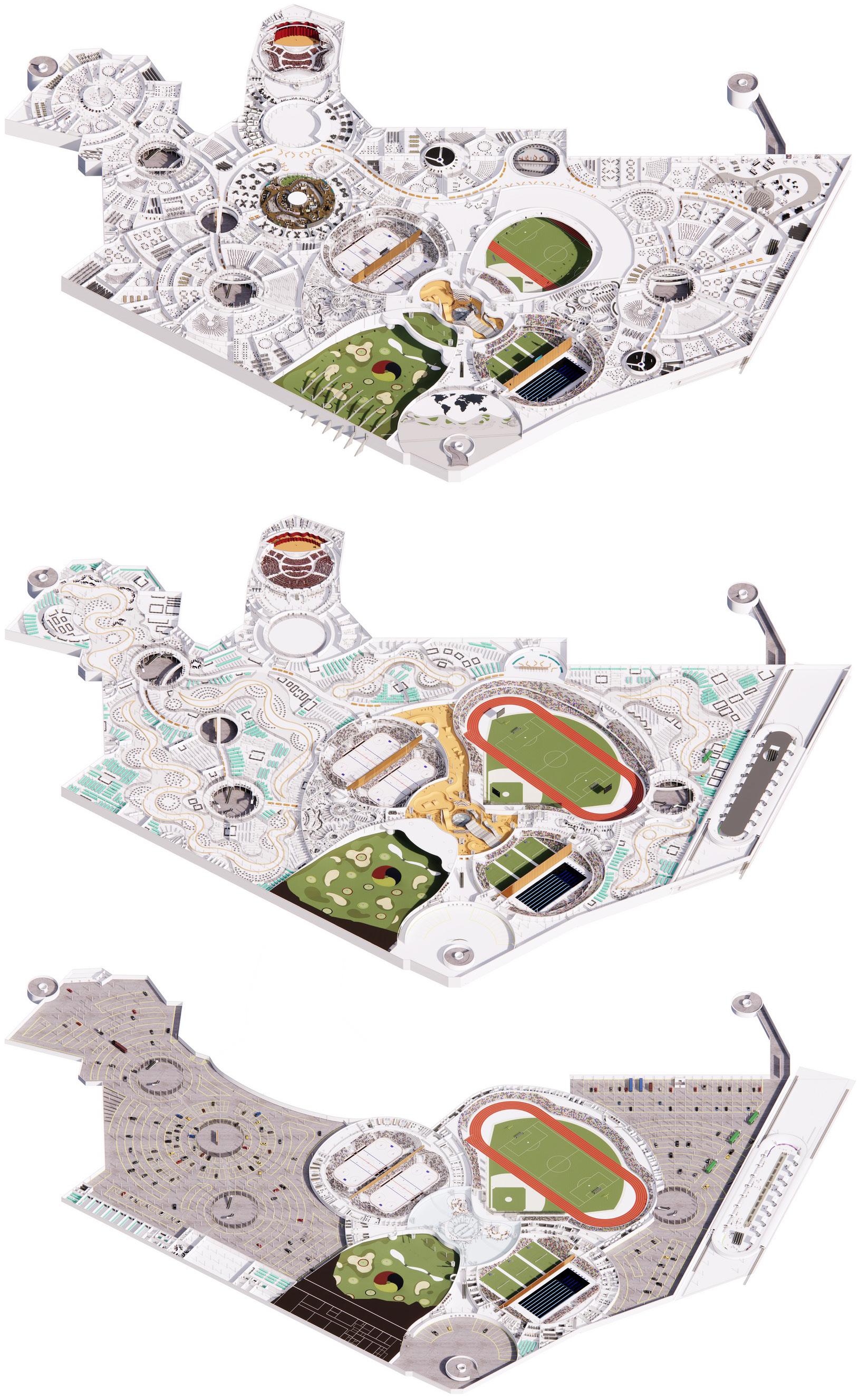Entrances to the complex are provided from three sides: south, west and east. The above-ground area serves as a golf course, which includes 7 playing fields, including a canyon, a desert, artificial water bodies with a waterfall, and a forest. In addition to the buildings, the master plan also includes a swimming pool with artificial waves, a go-kart track and a central park in the center of the sports complex with an aquarium, at the bottom of which there is an underwater cafe on the lowest level