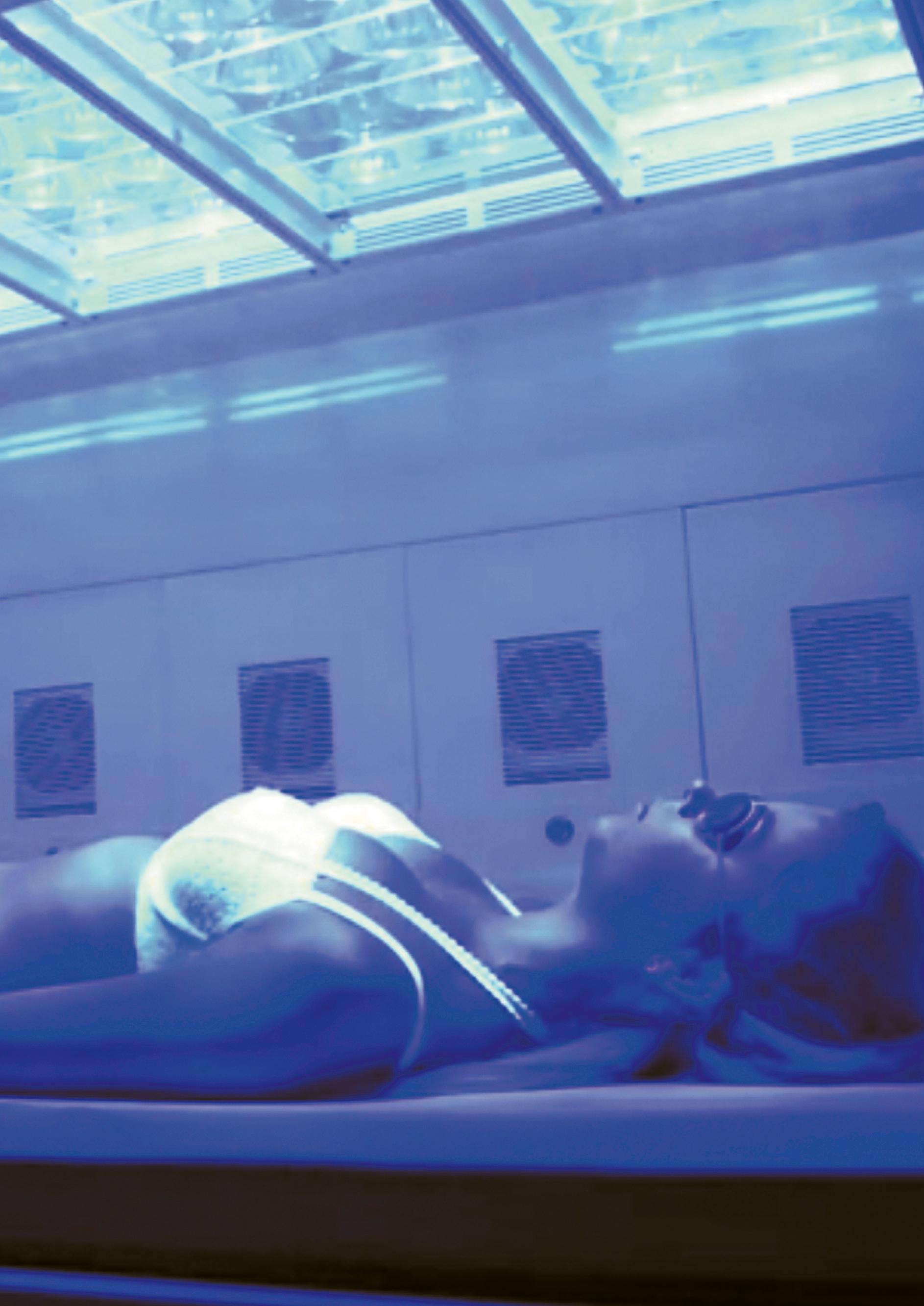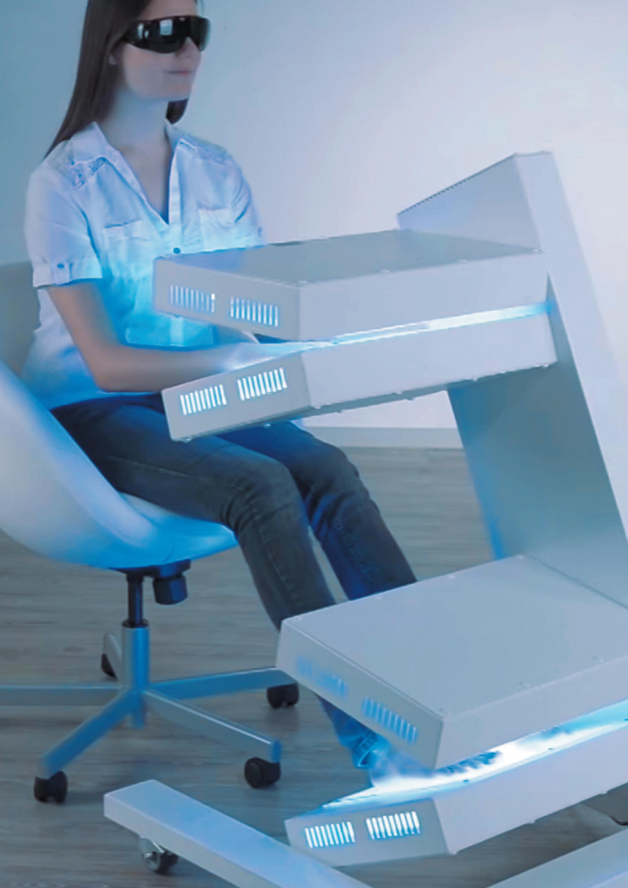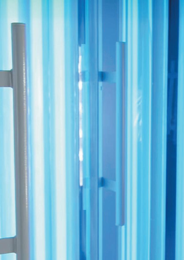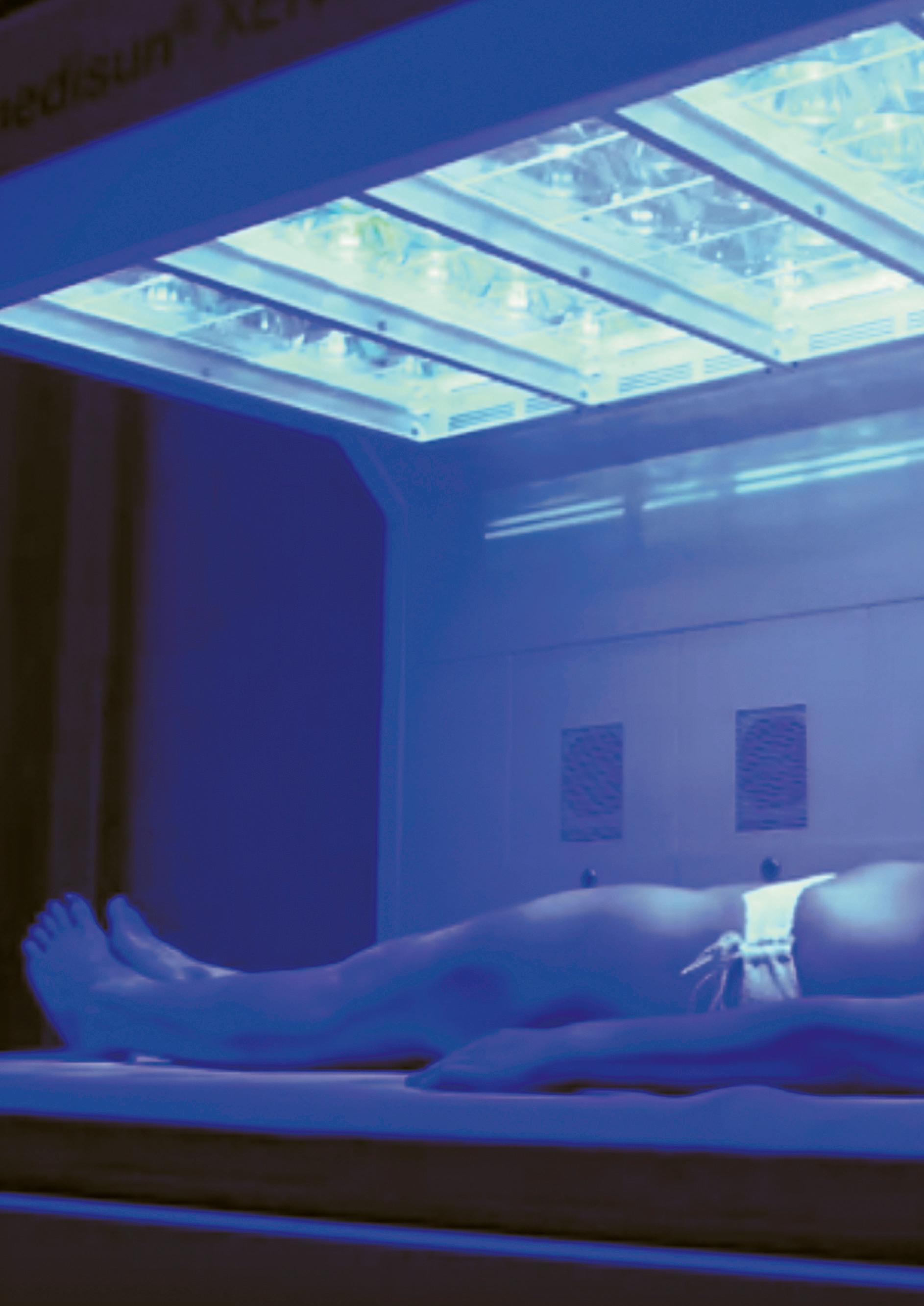 Die ergonomische Anordnung der acht Module mit jeweils fünf UV-Lampen bieten, in Verbindung mit der neu entwickelten Lampensteuerung, eine opti mierte Dosisgenauigkeit und homogene Belichtung von Kopf bis Fuss.