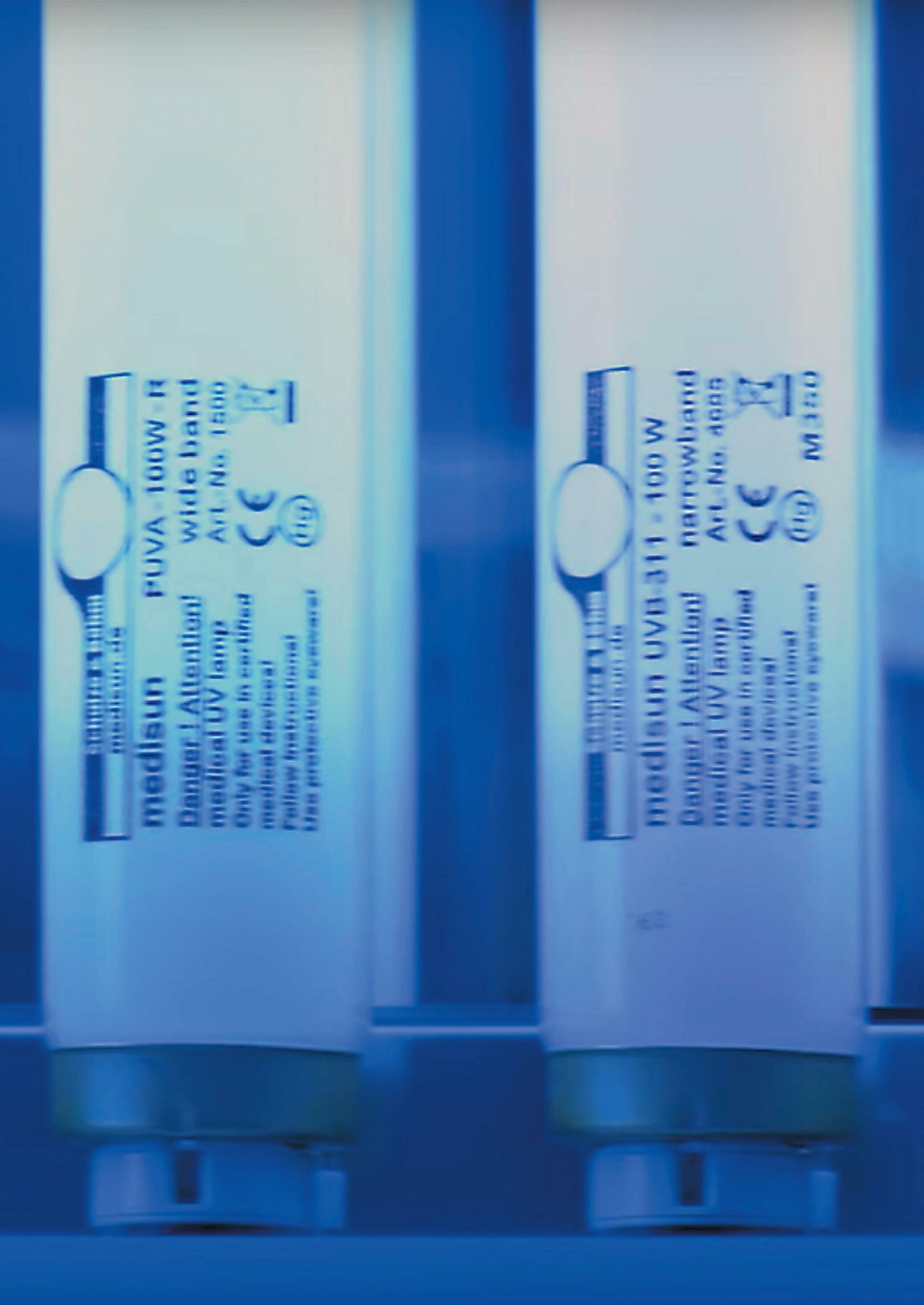 Exklusiv für Sie vertreten wir die umfang reiche medisun® Produktpalette in der Schweiz. Phototherapiesysteme zur Behandlung von Hautkrankheiten wie Psoriasis, Neurodermitis, Vitiligo, aktini schen Keratosen, Sklerodermie und weiteren Autoimmunerkrankungen.